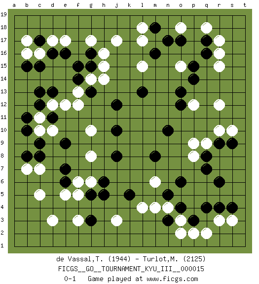Last move : 0-1 2011 February 19 13:0:59 [Event "FICGS__GO__TOURNAMENT_KYU_III__000015 "] [Site "FICGS"] [Date "2011.01.13"] [Round "1"] [Black "de Vassal,Thibault "] [White "Turlot,Morgan "] [Result "0-1"] [Rating 1 "1944"] [Rating 2 "2125"] 1.q4 c16 2.q17 d3 3.e16 g17 4.g16 h16 5.g15 j17 6.c17 d17 7.d16 e17 8.c15 b16 9.b15 b17 10.d13 c5 11.c9 o3 12.g3 j3 13.g5 l4 14.r6 r15 15.n17 r12 16.r9 f6 17.h6 g8 18.k5 m6 19.j8 q2 20.e9 g10 21.j10 r3 22.r4 r17 23.q16 r16 24.j12 c7 25.e7 g6 26.h5 l17 27.m18 l18 28.e6 f5 29.c8 o18 30.o17 q18 31.m16 l15 32.p14 o15 33.p15 p12 34.o13 s3 35.s4 b7 36.b8 e5 37.o12 s10 38.s9 r10 39.l13 h15 40.m8 q9 41.q8 p8 42.q7 p9 43.n10 g14 44.f14 f13 45.g13 h14 46.f15 f12 47.p3 p2 48.o4 n4 49.n3 o2 50.n5 m4 51.o6 d12 52.c12 c11 53.d11 e12 54.c13 d10 55.b11 c10 56.b10 f3 0-1 Here are the names of the openings (joseki) played in the four corners : Corner d16 : c16 e16Komoku (Somok, Xiao~mu`) 3-4 Point. The komoku (3-4) point is the traditional corner enclosure move..Ikken Takagakari (Hankan Nop'dakeolch'im, Yi Gaogua`jiao~, 1-Space High Approach). The 5-4 approach move has become more popular in modern times, as modern Go emphasizes speed and influence. Corner q4 : q4 o3Hoshi (Hwajeom, Seongjeom, Xingwei`) 4-4 Point. The star or hoshi (4-4) point, emphasizing influence at the potential expense of territory.Ikken Kakari (Hankan Keolch'im, Yi Gua`jiao~, 1-Space Low Approach). White 2 is the standard approach move to the 4-4. Corner q16 : q17 r15Komoku (Somok, Xiao~mu`) 3-4 Point. The komoku (3-4) point is the traditional corner enclosure move..Ikken Kakari (Hankan Keolch'im, Yi Gua`jiao~, 1-Space Low Pincer). The small knight move is the basic approach move to the 3-4 point stone. It has been continually used for over four centuries. There are limitless variations, with new moves constantly being discovered. White 2 opens the door to a treaure store of joseki. Player White won this Go (weiqi, baduk) game.Follow this game move after move (download ) Each step in a ladder is worth 7 points. (Anonymous) Happy endings are just stories that haven't finished yet. (Jane Smith in Mr & Mrs Smith)