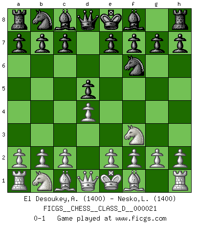 Last move : 0-1 2007 January 17 6:31:41 [Event "FICGS__CHESS__CLASS_D__000021"] [Site "FICGS"] [Date "2006.12.06"] [Round "1"] [White "El Desoukey,Ahmed"] [Black "Nesko,Lawrence"] [Result "0-1"] [WhiteElo "1400"] [BlackElo "1400"] 1.d4 d5 2.Nf3 Nf6 0-1 This chess game has been lost on time (started : 2006.12.06 0:55:48) Queen's pawn game Player Black won this chess game. Follow this game move after move (download)He who fears an isolated Queen's Pawn should give up Chess. (Siegbert Tarrasch) Ich organisiere ein großes Turnier, was mich etwa 120000 Dollar kostet. Ich denke, das ist das erste Mal in der Schachgeschichte, daß ein Schachgroßmeister auch als Mäzen auftritt. (Miguel Najdorf) Dejen al perfeccionista jugar por correo. (Yasser Seirawan) Vous m'avez demandé de vous exposer quel est le fondement de la prière. Je ne fais que préparer les pièces du jeu sur la table... Nous sera-t-il permis d'en adopter les règles et si nous les appliquons scrupuleusement nous ne tarderons pas à faire mat le Roi divin ! Il ne pourra échapper à nos mains. (Sainte Thérèse d'Avila, Chemin de perfection) Begin at the beginning and go on till you come to the end; then stop. (Lewis Carrol, Alice in Wonderland)