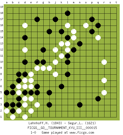 Last move : 1-0 2011 May 21 14:11:58 [Event "FICGS__GO__TOURNAMENT_KYU_III__000015"] [Site "FICGS"] [Date "2011.01.13"] [Round "1"] [Black "Lehnhoff,Heinz-Georg"] [White "Segur,Laurine"] [Result "1-0"] [Rating 1 "1843"] [Rating 2 "1621"] 1.q16 d4 2.q4 d16 3.f17 l16 4.j17 o16 5.p17 d12 6.c3 d3 7.c4 c6 8.d5 c5 9.e5 c2 10.b2 b4 11.b3 d1 12.b5 b1 13.l18 r10 14.h3 a4 15.a5 a2 16.a3 f3 17.b6 e2 18.h5 e4 19.c8 d7 20.c7 d6 21.f6 e6 22.f5 e8 23.d10 f9 24.d8 e7 25.f10 g9 26.g10 h9 27.k6 j8 28.l8 j10 29.l10 k11 30.g12 q14 31.p15 r7 32.n3 r5 33.l11 j12 34.k15 m15 35.h15 k13 36.n13 l12 37.l14 m14 38.m12 l13 39.d14 1-0 Here are the names of the openings (joseki) played in the four corners : Corner d16 : d16 f17 Hoshi (Hwajeom, Seongjeom, Xingwei`) 4-4 Point. The star or hoshi (4-4) point, emphasizing influence at the potential expense of territory. Ikken Kakari (Hankan Keolch'im, Yi Gua`jiao~, 1-Space Low Approach). Black 2 is the standard approach move to the 4-4. Corner q16 : q16 l16 Hoshi (Hwajeom, Seongjeom, Xingwei`) 4-4 Point. The star or hoshi (4-4) point, emphasizing influence at the potential expense of territory. Corner d4 : d4 c3 Hoshi (Hwajeom, Seongjeom, Xingwei`) 4-4 Point. The star or hoshi (4-4) point, emphasizing influence at the potential expense of territory. Player Black won this Go (weiqi, baduk) game. Follow this game move after move (download)Strange things happen at the one-two points. (Anonymous) Life is painting a picture, not doing a sum. (Oliver Wendell Holmes, Jr.)