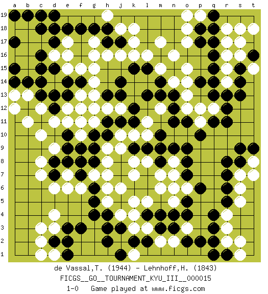 Last move : 1-0 2011 June 2 16:45:48 [Event "FICGS__GO__TOURNAMENT_KYU_III__000015"] [Site "FICGS"] [Date "2011.01.13"] [Round "1"] [Black "de Vassal,Thibault"] [White "Lehnhoff,Heinz-Georg"] [Result "1-0"] [Rating 1 "1944"] [Rating 2 "1843"] 1.q4 d16 2.q17 d4 3.q11 n16 4.q15 k16 5.c14 c10 6.c16 c17 7.d15 b16 8.c15 o3 9.d17 e16 10.c18 b17 11.e18 b18 12.f18 g16 13.h17 h16 14.j17 j16 15.f14 k17 16.f3 d6 17.d2 c3 18.j3 j18 19.h18 c12 20.p2 l3 21.k2 g17 22.g18 e17 23.d18 r3 24.q3 r4 25.r5 s5 26.r6 s6 27.r7 s7 28.o5 l5 29.r8 f12 30.f9 h9 31.g10 g13 32.h10 j9 33.j11 k10 34.k12 l11 35.l13 m12 36.f8 g7 37.f7 f6 38.m14 n14 39.m16 m17 40.n15 o15 41.n13 m15 42.m13 o13 43.n12 o12 44.n11 n8 45.o11 p11 46.p10 p12 47.o9 q12 48.r11 m6 49.j5 k7 50.r12 b15 51.b14 b13 52.a15 a16 53.a14 a18 54.b19 c19 55.p14 o14 56.q13 k18 57.d8 c8 58.d7 c7 59.n4 g14 60.e14 j6 61.g4 h5 62.h4 r2 63.s8 e11 64.n3 c2 65.e3 k5 66.o8 n7 67.p17 d1 68.e1 c1 69.l2 o18 70.p18 o17 71.m10 h19 72.d19 p19 73.q19 o19 74.l9 l8 75.q2 d9 76.r1 s1 77.q1 s2 78.g5 j4 79.g6 h6 80.g8 h7 81.b12 b11 82.c13 a12 83.d12 e12 84.d13 d11 85.j14 h8 86.o7 t8 87.t9 t7 88.s9 k3 89.m3 j2 90.h3 e6 91.l15 l16 92.k15 r18 93.q18 s16 94.s15 r16 95.q16 r15 96.s14 r14 97.r13 f10 98.g9 o6 99.p6 g15 100.n9 n6 101.e10 f11 102.e9 g11 103.h13 h12 104.h11 j12 105.j13 g12 106.k11 l10 107.k9 j10 108.m8 k8 109.m9 m7 110.l4 k4 111.m4 k1 112.h2 a13 113.c19 r17 114.q14 e15 115.e13 t15 116.s13 m2 117.j1 n2 118.o2 n5 119.o4 f15 120.a19 e7 121.e8 d3 122.e2 f13 123.a17 s18 124.t17 t18 125.t16 s17 126.t16 1-0 Comment by player 1 : Thibault de Vassal : Thank you! I feel it will be much harder to beat you now :) Here are the names of the openings (joseki) played in the four corners : Corner d16 : d16 c14 Hoshi (Hwajeom, Seongjeom, Xingwei`) 4-4 Point. The star or hoshi (4-4) point, emphasizing influence at the potential expense of territory. Ikken Kakari (Hankan Keolch'im, Yi Gua`jiao~, 1-Space Low Approach). Black 2 is the standard approach move to the 4-4. Corner q4 : q4 o3 Hoshi (Hwajeom, Seongjeom, Xingwei`) 4-4 Point. The star or hoshi (4-4) point, emphasizing influence at the potential expense of territory. Ikken Kakari (Hankan Keolch'im, Yi Gua`jiao~, 1-Space Low Approach). White 2 is the standard approach move to the 4-4. Corner d4 : d4 f3 Hoshi (Hwajeom, Seongjeom, Xingwei`) 4-4 Point. The star or hoshi (4-4) point, emphasizing influence at the potential expense of territory. Ikken Kakari (Hankan Keolch'im, Yi Gua`jiao~, 1-Space Low Approach). Black 2 is the standard approach move to the 4-4. Player Black won this Go (weiqi, baduk) game. Follow this game move after move (download)Don't overlook the edge of the board. (Anonymous) The problem with manipulation is that people can turn on you. (Horatio Caine, C.S.I. Miami)