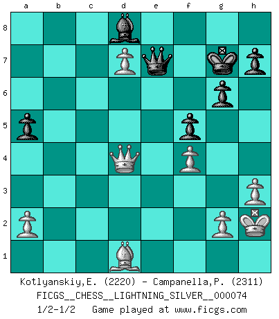 Last move : 1/2-1/2 2011 January 13 0:59:13 [Event "FICGS__CHESS__LIGHTNING_SILVER__000074"] [Site "FICGS"] [Date "2011.01.13"] [Round "1"] [White "Kotlyanskiy,Edward"] [Black "Campanella,Paul"] [Result "1/2-1/2"] [WhiteElo "2220"] [BlackElo "2311"] 1.e4 e5 2.Nf3 Nf6 3.d4 Nxe4 4.Bd3 d5 5.Nxe5 Nd7 6.Nxd7 Bxd7 7.O-O Bd6 8.c4 c6 9.cxd5 cxd5 10.Nc3 Nxc3 11.bxc3 O-O 12.Qh5 f5 13.Qf3 Kh8 14.Bd2 Qc7 15.h3 g6 16.Qxd5 Kg7 17.Qf3 Rae8 18.c4 Bc6 19.d5 Bd7 20.Rfe1 Bh2+ 21.Kh1 Be5 22.Rad1 b6 23.Bf1 Kg8 24.Bh6 Ba4 25.d6 Bxd1 26.Rxd1 Qf7 27.Bxf8 Rxf8 28.c5 bxc5 29.Qc6 Bf6 30.Qxc5 Kg7 31.Rb1 Kh6 32.Bc4 Qg7 33.Re1 Bd4 34.Qd5 Qf6 35.Bb5 Bb6 36.Qd2+ Qg5 37.f4 Qg3 38.d7 Rd8 39.Re8 Bc7 40.Rxd8 Bxd8 41.Bc4 a5 42.Bb3 Kg7 43.Bd1 Qh4 44.Kh2 Qe7 45.Qd4+ 1/2-1/2 Petrov : Modern attack, Symmetrical variation Kingside Castling by player White (move 7) Kingside Castling by player Black (move 11) This chess game ended in a draw. Follow this game move after move (download)No one ever won a game by resigning. (Unknown) Ich hatte meine größten Erfolge, als ich 47 Jahre alt war. Kasparow war noch nicht mal 42 und hat das Schach schon im Stich gelassen. (Viktor Kortschnoi) Los tropiezos estan todos ahí en el tablero, esperando que se cometan. (Savielly Tartakover) Les sacrifices démontrent seulement que quelqu'un a gaffé. (Savielly Tartacover) It's unlucky to be superstitious. (Dave Enteles)