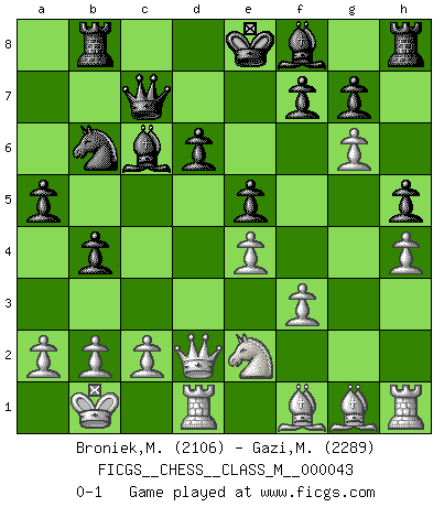 Last move : 0-1 2011 June 22 16:50:52 [Event "FICGS__CHESS__CLASS_M__000043"] [Site "FICGS"] [Date "2011.01.13"] [Round "1"] [White "Broniek,Mariusz Maciej"] [Black "Gazi,Miroslav"] [Result "0-1"] [WhiteElo "2106"] [BlackElo "2289"] 1.e4 c5 2.Nf3 d6 3.d4 cxd4 4.Nxd4 Nf6 5.Nc3 a6 6.Be3 e6 7.f3 Qc7 8.Qd2 b5 9.g4 h6 10.O-O-O Bb7 11.h4 Nc6 12.Nxc6 Bxc6 13.Bf4 b4 14.Ne2 e5 15.Bh2 a5 16.Kb1 h5 17.g5 Nd7 18.g6 Nb6 19.Bg1 Rb8 0-1 Sicilian : Najdorf, Byrne (English) attack Queenside Castling by player White (move 10) Player Black won this chess game. Follow this game move after move (download)Pawn endings are to Chess what putting is to golf. (Cecil Purdy) Am wohlsten fühle ich mich, wenn ich sehe, wie sich mein Gegner im Todeskampf windet. (Robert James Fischer) Jugadores de primera clase pierden en contra de jugadores de segunda clase porque los jugadores de segunda clase a veces juegan una partida de primer clase. (Siegbert Tarrasch) Il n'y a plus de joueurs du niveau de Jacob Murray dont la seule quête est le beau jeu, le plaisir de voir les pièces construire quelque chose. Sur 10 idées à la minute, 9 seront sans intérêt, la dernière s'avèrera géniale. (Christian Bauer) Fortune favours the audacious. (Desiderius Erasmus)