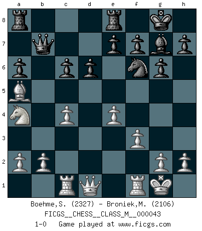 Last move : 1-0 2011 June 22 16:51:5 [Event "FICGS__CHESS__CLASS_M__000043"] [Site "FICGS"] [Date "2011.01.13"] [Round "1"] [White "Boehme,Sebastian"] [Black "Broniek,Mariusz Maciej"] [Result "1-0"] [WhiteElo "2327"] [BlackElo "2106"] 1.e4 c5 2.Nf3 d6 3.Bb5+ Bd7 4.Bxd7+ Qxd7 5.c4 Nc6 6.Nc3 g6 7.d4 cxd4 8.Nxd4 Bg7 9.Be3 Nf6 10.f3 O-O 11.Rc1 a6 12.Nxc6 bxc6 13.O-O Rfd8 14.Na4 Qb7 15.Bb6 Re8 16.Ba5 1-0 Sicilian : Canal-Sokolsky attack, Sokolsky variation Kingside Castling by player Black (move 10) Kingside Castling by player White (move 13) Player White won this chess game. Follow this game move after move (download)The older I grow, the more I value pawns. (Paul Keres) Es ist peinlich, dass ich nie Weltmeister wurde. Es wäre leicht, Leonid Breschnjew als Ursache vorzuschieben, dessen Apparat den Vorzeigekommunisten Anatoli Karpow in allem unterstützte. Aber Garri Kasparow zum Beispiel, der ebenfalls von den Sowjets unerwünscht war, hat trotz der Widerstände den WM-Titel erobert. (Viktor Kortschnoi) La última cosa en que Fischer estaba interesado era en tonterías, siempre y cuando el Ajedrez estuviera involucrado. (Elie Agur) Si rien de grave n'est détecté lors de l'analyse d'une position, on joue alors le coup. Seconde règle de Blumenfeld. There's always a bigger fish. (Qui-Gon Jinn in Star Wars ep.1)