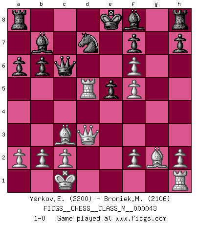 Last move : 1-0 2011 June 22 16:51:18 [Event "FICGS__CHESS__CLASS_M__000043"] [Site "FICGS"] [Date "2011.01.13"] [Round "1"] [White "Yarkov,Evgeny"] [Black "Broniek,Mariusz Maciej"] [Result "1-0"] [WhiteElo "2200"] [BlackElo "2106"] 1.e4 c5 2.Nf3 d6 3.d4 cxd4 4.Nxd4 Nf6 5.Nc3 a6 6.Be3 e6 7.g4 e5 8.Nf5 g6 9.g5 gxf5 10.exf5 d5 11.Qf3 d4 12.O-O-O Nbd7 13.Bd2 Qc7 14.gxf6 dxc3 15.Bxc3 Qc6 16.Rd5 b6 17.Bg2 Bb7 18.Qd3 1-0 Sicilian : Najdorf, Byrne (English) attack Queenside Castling by player White (move 12) Player White won this chess game. Follow this game move after move (download)Pawns are born free, yet they are everywhere in chains. (Rick Kennedy) Kasparov ist eine Art Monster mit hundert Augen, denen auch nicht das Geringste entgeht. (Tony Miles) El poder defensivo de una pieza clavada, solamente es imaginario. (Aaron Nimzovich) J'ai vu le vaincu d'Echecs jouer des années durant dans l'espoir de la fête de la victoire. Car tu es plus riche de ce qu'elle existe si même elle n'est point pour toi. Ainsi de la perle du fond des mers. (Antoine de Saint-Exupéry) The mind is like a parachute, it only functions when its open. (Unknown)