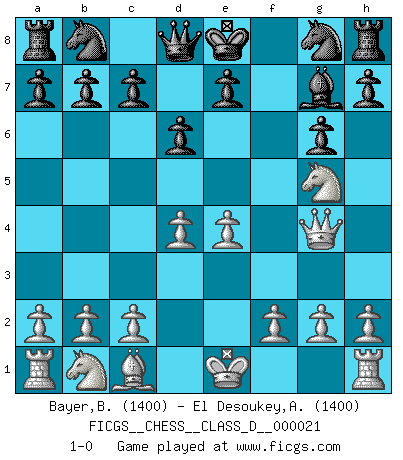 Last move : 1-0 2007 January 18 6:35:21 [Event "FICGS__CHESS__CLASS_D__000021"] [Site "FICGS"] [Date "2006.12.06"] [Round "1"] [White "Bayer,Bernhard"] [Black "El Desoukey,Ahmed"] [Result "1-0"] [WhiteElo "1400"] [BlackElo "1400"] 1.e4 d6 2.d4 g6 3.Nf3 Bg4 4.Bc4 Bg7 5.Bxf7+ Kxf7 6.Ng5+ Ke8 7.Qxg4 1-0 This chess game has been lost on time (started : 2006.12.06 0:55:48) King's pawn Opening Player White won this chess game. Follow this game move after move (download)Chess demands total concentration. (Bobby Fischer) Im Schach gewinnt jeder. Hat man Freunde am Spiel - und das ist die Hauptsache - ist auch der Verlust einer Partie kein Unglück. (David Bronstein) Mis oponentes también hacen buenas movidas. A veces yo no tomo esas cosas en consideración. (Bobby Fischer) Pour se monter efficace, un Cavalier a besoin d'avant-postes ! Les Cavaliers font les meilleurs bloqueurs de pions passés. You can't play chess if you're groggy from pills. (Anatoly Karpov)
