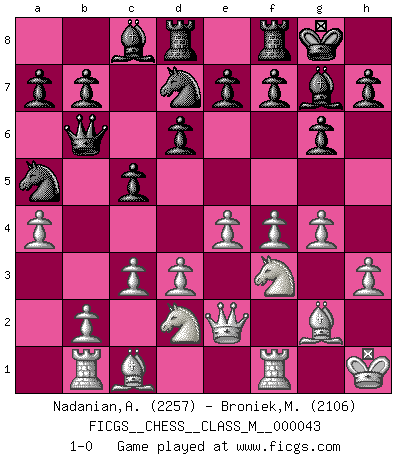Last move : 1-0 2011 June 22 16:51:30 [Event "FICGS__CHESS__CLASS_M__000043"] [Site "FICGS"] [Date "2011.01.13"] [Round "1"] [White "Nadanian,Ashot"] [Black "Broniek,Mariusz Maciej"] [Result "1-0"] [WhiteElo "2257"] [BlackElo "2106"] 1.e4 c5 2.d3 Nc6 3.f4 g6 4.Nf3 Bg7 5.g3 d6 6.Bg2 Nf6 7.O-O O-O 8.c3 Rb8 9.a4 Na5 10.Nbd2 Qb6 11.Qe2 Be6 12.h3 Rbd8 13.g4 Bc8 14.Kh1 Nd7 15.Rb1 1-0 Sicilian defense Kingside Castling by player White (move 7) Kingside Castling by player Black (move 7) Player White won this chess game. Follow this game move after move (download)Of all my Russian books, the defense contains and diffuses the greatest 'warmth' which may seem odd seeing how supremely abstract Chess is supposed to be. (Vladimir Nabokov) Schach sollte überall auf der Welt Schulfach werden. Es fördert die geistige Auseinandersetzung. Es lehrt die Demut in der Niederlage. (Garry Kasparov) Los Peones son el alma de una partida de Ajedrez. (Francois Andre Danican Philidor) Plusieurs personnes se sont demandées comment Tal faisait pour gagner... En fait, c'est très simple ! Il met ses pièces au centre de l'échiquier et les sacrifie quelque part ! (David Bronstein) Optimism is a variety of information deficit. Sometimes especially true for correspondence chess games. (Michael Aigner)