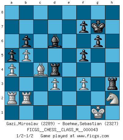Last move : 1/2-1/2 2011 November 5 20:6:37 [Event "FICGS__CHESS__CLASS_M__000043"] [Site "FICGS"] [Date "2011.01.13"] [Round "1"] [White "Gazi,Miroslav"] [Black "Boehme,Sebastian"] [Result "1/2-1/2"] [WhiteElo "2289"] [BlackElo "2327"] 1.e4 e5 2.Nf3 Nc6 3.Bc4 Bc5 4.c3 Nf6 5.b4 Bb6 6.d3 O-O 7.a4 a5 8.b5 Ne7 9.Nxe5 c6 10.O-O d5 11.exd5 cxd5 12.Bb3 Re8 13.Nd2 Qc7 14.Ndf3 Ng6 15.Nxg6 hxg6 16.c4 dxc4 17.Bxc4 Bg4 18.Ra2 Rad8 19.Bg5 Qc8 20.h3 Bxh3 21.gxh3 Qxh3 22.Bxf6 gxf6 23.Nh2 Rd4 24.Qf3 Qxf3 25.Nxf3 Rg4+ 26.Kh1 Kg7 27.Nh2 Rh4 28.f3 Bc5 29.Rd1 Reh8 30.Bd5 b6 31.Rc1 Bd6 32.R1c2 Rb4 33.Rcb2 Rd4 34.Bc4 Rh3 35.Kg1 f5 1/2-1/2 Giuoco Piano : Bird's attack Kingside Castling by player Black (move 6) Kingside Castling by player White (move 10) This chess game ended in a draw. Follow this game move after move (download)He who fears an isolated Queen's Pawn should give up Chess. (Siegbert Tarrasch) Ja, ich habe einmal eine Blitzpartie gespielt, es war in einem Zug, 1929. --im Interview 1989 (Mikhail Moiseyevich Botvinik) La estratégia requiere pensar, la táctica requiere observación. (Max Euwe) Vous m'avez demandé de vous exposer quel est le fondement de la prière. Je ne fais que préparer les pièces du jeu sur la table... Nous sera-t-il permis d'en adopter les règles et si nous les appliquons scrupuleusement nous ne tarderons pas à faire mat le Roi divin ! Il ne pourra échapper à nos mains. (Sainte Thérèse d'Avila, Chemin de perfection) . 'gn is not allowed in chess unless n is an integer between 1 and 8 inclusive, where 1 and 8 are to interpreted as the standard numerals standing for integers in the ordered real-closed field R, with the *canonical* ordering. (As opposed to, say, an integer in the domain Z[2+i*sqrt(5)] or an integer in some exotic Grothendieck topos). (Normajean Yates)
