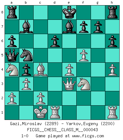 Last move : 1-0 2011 June 20 19:58:37 [Event "FICGS__CHESS__CLASS_M__000043"] [Site "FICGS"] [Date "2011.01.13"] [Round "1"] [White "Gazi,Miroslav"] [Black "Yarkov,Evgeny"] [Result "1-0"] [WhiteElo "2289"] [BlackElo "2200"] 1.e4 c5 2.Nf3 d6 3.d4 cxd4 4.Nxd4 Nf6 5.Nc3 Nc6 6.Bg5 e6 7.Qd2 a6 8.f4 h6 9.Bxf6 Qxf6 10.Nf3 Qd8 11.h4 b5 12.O-O-O b4 13.Na4 Be7 14.g4 Bb7 15.Qe3 Qa5 16.b3 Na7 17.f5 exf5 18.gxf5 Nb5 19.Bc4 1-0 This chess game has been lost on time (started : 2011.01.13 10:23:40) Sicilian : Richter-Rauzer, Rauzer attack, 7...a6 Queenside Castling by player White (move 12) Player White won this chess game. Follow this game move after move (download)It is peculiar but a fact nevertheless, that gamblers in chess always have enthusiastic followers. (Botvinnik) Ich hatte meine größten Erfolge, als ich 47 Jahre alt war. Kasparow war noch nicht mal 42 und hat das Schach schon im Stich gelassen. (Viktor Kortschnoi) No es tiempo de jugar al Ajedrez cuando la casa esta en llamas. (Proverbio Italiano) Les ravages du H expliquent la différence de niveau entre Tal et Thal [Abergel]. Art disturbs, science reassures. (Georges Braque, Le Jour et la Nuit)