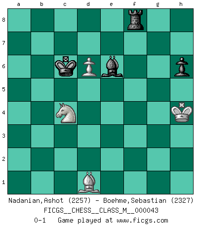 Last move : 0-1 2011 November 13 7:45:52 [Event "FICGS__CHESS__CLASS_M__000043"] [Site "FICGS"] [Date "2011.01.13"] [Round "1"] [White "Nadanian,Ashot"] [Black "Boehme,Sebastian"] [Result "0-1"] [WhiteElo "2257"] [BlackElo "2327"] 1.d4 Nf6 2.c4 e6 3.Nf3 b6 4.g3 Bb7 5.Bg2 Be7 6.O-O O-O 7.Nc3 Ne4 8.Qd3 Nxc3 9.Qxc3 c5 10.Rd1 d6 11.Qc2 Nc6 12.d5 exd5 13.cxd5 Nb4 14.Qb1 Re8 15.e4 Na6 16.Nd2 Bf6 17.Nc4 b5 18.Ne3 Nc7 19.a4 Bc8 20.Bd2 a5 21.axb5 Nxb5 22.Nc4 a4 23.Qd3 Bd7 24.Rab1 Qb8 25.Bf4 g5 26.Be3 Nd4 27.Bxd4 Bxd4 28.Qf3 Rf8 29.Rxd4 cxd4 30.Qf6 Qd8 31.Qxd4 Bb5 32.Ne3 Qe7 33.Bf1 Bd7 34.Rc1 Qe5 35.Qxe5 dxe5 36.Nc4 Rfc8 37.Rd1 Re8 38.Nb6 Bg4 39.Rd2 Rab8 40.Nxa4 Rb4 41.Nc3 Reb8 42.f4 exf4 43.gxf4 Rxb2 44.Rxb2 Rxb2 45.fxg5 Kg7 46.h3 Bd7 47.e5 Rb4 48.d6 Be6 49.Kf2 Rf4+ 50.Ke1 Rf5 51.h4 Rxe5+ 52.Kd2 Bd7 53.Bc4 f6 54.Kd3 fxg5 55.Kd4 Ra5 56.hxg5 Rxg5 57.Ne4 Rg6 58.Ke5 Bg4 59.Bd3 h6 60.Kf4 Kf7 61.Nc5 Rg5 62.Ne4 Rg7 63.Bc4+ Kf8 64.Nf6 Bh3 65.Be2 Rg6 66.Ke5 Rg5+ 67.Kd4 Kf7 68.Ne4 Rg1 69.Ke5 Ke8 70.Kf4 Kd8 71.Bh5 Rf1+ 72.Kg3 Bd7 73.Be2 Rf7 74.Bh5 Rf8 75.Nd2 Bf5 76.Bd1 Kd7 77.Nc4 Kc6 78.Kh4 Be6 0-1 Queen's Indian : Old Main line, 7.Nc3 Kingside Castling by player White (move 6) Kingside Castling by player Black (move 6) 10 pieces endgame at move 54 : White KBNPP , Black KRBPP WHITE : King + 1 Bishop 1 Knight 2 Pawns BLACK : King + 1 Rook 1 Bishop 2 Pawns 9 pieces endgame at move 56 : White KBNPP , Black KRBP WHITE : King + 1 Bishop 1 Knight 2 Pawns BLACK : King + 1 Rook 1 Bishop 1 Pawn 8 pieces endgame at move 56 : White KBNP , Black KRBP WHITE : King + 1 Bishop 1 Knight 1 Pawn BLACK : King + 1 Rook 1 Bishop 1 Pawn Player Black won this chess game. Follow this game move after move (download)The most important feature of the Chess position is the activity of the pieces. This is absolutely fundamental in all phases of the game: Opening, Middlegame and especially Endgame. The primary constraint on a piece's activity is the Pawn structure. (Michael Stean) Der vorletzte Fehler gewinnt. (Savielly Grigorievitsch Tartakower) Debemos de asegurarnos de que el Ajedrez no se convierta en un lenguaje muerto, muy interesante, pero solo para un grupo muy pequeño. (Sytze Faber) Le temps de noter son nom sur la feuille de partie, j'étais déjà en zeitnot ! D'un modeste amateur apparié lors de la première ronde d'un open contre le grand-maître Azmaïparashvili. Don't anthropomorphize computers - they hate it. (Anonymous)