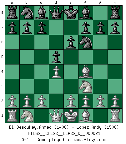 Last move : 0-1 2007 January 15 18:22:56 [Event "FICGS__CHESS__CLASS_D__000021"] [Site "FICGS"] [Date "2006.12.06"] [Round "1"] [White "El Desoukey,Ahmed"] [Black "Lopez,Andy"] [Result "0-1"] [WhiteElo "1400"] [BlackElo "1500"] 1.d4 d5 2.Nf3 Nf6 3.Bf4 e6 0-1 This chess game has been lost on time (started : 2006.12.06 0:55:48) Queen's Bishop game Player Black won this chess game. Follow this game move after move (download)A good player is always lucky. (Jose Raul Capablanca) Du weisst es gibt ein Problem mit Computern und Fernschach, wenn jeder eine Rating von 2450 hat. (John Christen Knudsen) El Ajedrez no es como la vida... ¡tiene reglas!. (Mark Pasternak) Assurément je connaissais par expérience le mystérieux attrait de ce jeu royal, le seul entre tous les jeux inventés par les hommes qui échappe souverainement à la tyrannie du hasard, le seul où l'on ne doive sa victoire qu'à son intelligence ou plutôt à une certaine forme d'intelligence. Mais n'est-ce pas déjà le limiter injurieusement que d'appeler les échecs un jeu ? N'est-ce pas une science, un art ou quelque chose qui, comme le cercueil de Mahomet entre ciel et terre, est suspendu entre l'un et l'autre, et qui réunit un nombre incroyable de contraires ? [...] C'est une pensée qui ne mène à rien, une mathématique qui n'établit rien, un art qui ne laisse pas d'uvre, une architecture sans matière; et il l'a prouvé néanmoins qu'il était plus durable, à sa manière, que les livres ou que tout autre monument, ce jeu unique qui appartient à tous les peuples et à tous les temps, et dont personne ne sait quel dieu en fit don à la terre pour tuer l'ennui, pour aiguiser l'esprit et stimuler l'âme. Où commence-t-il, où finit-il ? (Stefan Zweig) Internet: Absolute communication, absolute isolation. (Paul Carvel)