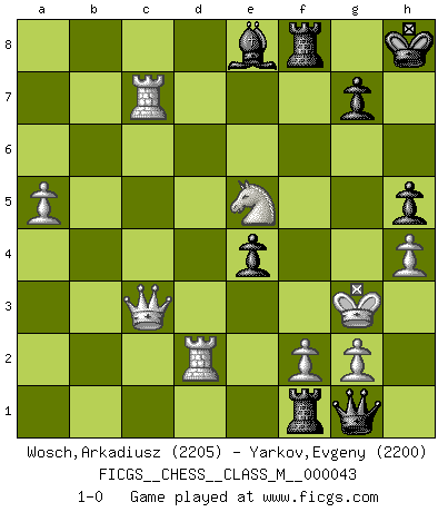 Last move : 1-0 2012 January 16 15:32:26 [Event "FICGS__CHESS__CLASS_M__000043"] [Site "FICGS"] [Date "2011.01.13"] [Round "1"] [White "Wosch,Arkadiusz"] [Black "Yarkov,Evgeny"] [Result "1-0"] [WhiteElo "2205"] [BlackElo "2200"] 1.e4 c5 2.Nf3 Nc6 3.d4 cxd4 4.Nxd4 Nf6 5.Nc3 e5 6.Ndb5 d6 7.Bg5 a6 8.Na3 b5 9.Nd5 Be7 10.Bxf6 Bxf6 11.c3 O-O 12.Nc2 Bg5 13.a4 bxa4 14.Rxa4 a5 15.Bc4 Rb8 16.b3 Kh8 17.O-O f5 18.exf5 Bxf5 19.Nce3 Bg6 20.Qe2 e4 21.Rfa1 Qc8 22.Bb5 Bh4 23.Rf1 Bg5 24.h3 Rd8 25.Rfa1 Bxe3 26.Nxe3 d5 27.Bxc6 Qxc6 28.Qb2 Rdc8 29.c4 dxc4 30.Rxc4 Qb5 31.Qc3 Rg8 32.Ra3 Rb7 33.Ng4 Qd5 34.Ne5 Be8 35.Rc5 Qd1+ 36.Kh2 a4 37.bxa4 Rb1 38.Ra2 h6 39.a5 h5 40.h4 Rf8 41.Rd2 Qg1+ 42.Kg3 Rf1 43.Rc7 1-0 Sicilian : Pelikan (Lasker/Sveshnikov) variation Kingside Castling by player Black (move 11) Kingside Castling by player White (move 17) Player White won this chess game. Follow this game move after move (download)Chess, like love, is infectious at any age. (Flohr) Ja, jede Frau in Holland liebt mich bestimmt, und alle Männer hassen mich. (Loek van Wely) Bobby es el jugador de Ajedrez mas fino que este país jamás haya producido. Su memoria para las movidas, su brillantez en soñar combinaciones y su feróz determinación por la victoria son algo extraño. (John Collins) 'L'échange des dames est un coup dur pour les deux adversaires...' Un journaliste lors d'une partie du match Spassky-Fischer Always remember that you are unique; just like everyone else. (Unknown)