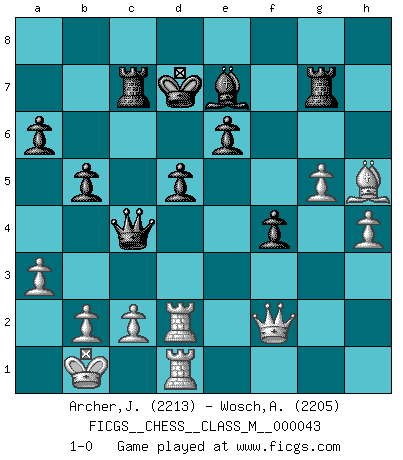 Last move : 1-0 2011 October 12 7:36:39 [Event "FICGS__CHESS__CLASS_M__000043"] [Site "FICGS"] [Date "2011.01.13"] [Round "1"] [White "Archer,J. Robert"] [Black "Wosch,Arkadiusz"] [Result "1-0"] [WhiteElo "2213"] [BlackElo "2205"] 1.e4 c5 2.Nf3 Nc6 3.d4 cxd4 4.Nxd4 Nf6 5.Nc3 d6 6.Bg5 e6 7.Qd2 a6 8.O-O-O Bd7 9.f4 b5 10.Bxf6 gxf6 11.Kb1 Qb6 12.Nxc6 Bxc6 13.f5 h5 14.Qe1 Be7 15.Qh4 Kd7 16.Qh3 Qc5 17.Be2 Rac8 18.Rd2 Qe5 19.Rhd1 Bxe4 20.Nxe4 Qxe4 21.fxe6+ fxe6 22.Bf3 Qb4 23.a3 Qf4 24.Rf2 Qc4 25.Re2 f5 26.Qg3 Rhg8 27.Qe5 Rc5 28.Qe3 Bg5 29.Qf2 Rc7 30.Bxh5 Rg7 31.g4 f4 32.Red2 d5 33.h4 Be7 34.g5 1-0 Sicilian defense Queenside Castling by player White (move 8) Player White won this chess game. Follow this game move after move (download)All my games are real. (Bobby Fischer) Schach ist ein Reich, wo sich die menschliche Phantasie frei entfalten kann. (David Bronstein) Fischer es el jugador mas fuerte del mundo. De hecho, el jugador mas fuerte que jamas haya existido. (Larry Evans) J'ai toujours senti une vague pitié pour l'homme qui ne connaît rien aux échecs, tout comme j'en aurais pour un homme ignorant de l'amour. Les Echecs, comme la musique ou comme l'amour, ont le pouvoir de rendre heureux. (Siegbert Tarrasch) The difference between stupidity and genius is that genius has its limits. (Murphy)