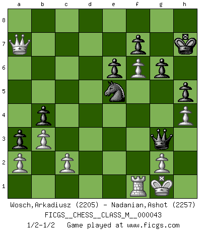 Last move : 1/2-1/2 2011 August 20 13:7:7 [Event "FICGS__CHESS__CLASS_M__000043"] [Site "FICGS"] [Date "2011.01.13"] [Round "1"] [White "Wosch,Arkadiusz"] [Black "Nadanian,Ashot"] [Result "1/2-1/2"] [WhiteElo "2205"] [BlackElo "2257"] 1.e4 c5 2.Nf3 Nc6 3.d4 cxd4 4.Nxd4 Qb6 5.Nb3 Nf6 6.Nc3 e6 7.Bd3 Be7 8.O-O a6 9.Be3 Qc7 10.f4 d6 11.Qf3 O-O 12.Rae1 b5 13.e5 dxe5 14.fxe5 Nd7 15.Bf4 Bb7 16.Qg3 g6 17.Be4 b4 18.Nd1 a5 19.Ne3 a4 20.Nd2 a3 21.b3 Ba6 22.Rf2 Rad8 23.Ng4 Nd4 24.Nf6+ Nxf6 25.exf6 Bd6 26.Qg5 Kh8 27.Bxd6 Qxd6 28.Qh6 Rg8 29.Re3 Qf8 30.Qg5 Rc8 31.Bd3 Bxd3 32.Rxd3 Rc5 33.Qh4 Nc6 34.Ne4 Rh5 35.Qg3 Ne5 36.Rd4 Qb8 37.h3 h6 38.Qe3 Rd8 39.Rxd8+ Qxd8 40.Ng3 Rg5 41.Rf1 Kh7 42.h4 Rxg3 43.Qxg3 Qd4+ 44.Qf2 Qc3 45.Kh1 h5 46.Qa7 Qg3 47.Kg1 1/2-1/2 Sicilian defense Kingside Castling by player White (move 8) Kingside Castling by player Black (move 11) This chess game ended in a draw. Follow this game move after move (download)The sign of a great Master is his ability to win a won game quickly and painlessly. (Irving Chernev) Ein Schachgenie ist jemand der verdammt gut Schach spielt. (Jonathan Levitt) En el Ajedrez, tal como es jugado por los Maestros, practicamente la suerte es eliminada. (Emanuel Lasker) À la honte des hommes, on sait que les lois du jeu sont les seules qui soient partout justes, claires, inviolables et exécutées. Pourquoi l'Indien qui a donné les règles du jeu d'échecs est-il obéi de bon gré dans toute la terre, et que les décrétales des papes, par exemple, sont aujourd'hui un objet d'horreur et de mépris ? C'est que l'inventeur des échecs combina tout avec justesse pour la satisfaction des joueurs, et que les papes, dans leurs décrétales, n'eurent en vue que leur seul avantage. L'Indien voulut exercer également l'esprit des hommes et leur donner du plaisir; les papes ont voulu abrutir l'esprit des hommes. Voltaire (Dictionnaire philosophique / Garnier 1967) The age of a woman doesn't mean a thing. The best tunes are played on the oldest fiddles. (Ralph Waldo Emerson)