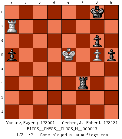 Last move : 1/2-1/2 2012 January 17 14:33:18 [Event "FICGS__CHESS__CLASS_M__000043"] [Site "FICGS"] [Date "2011.01.13"] [Round "1"] [White "Yarkov,Evgeny"] [Black "Archer,J. Robert"] [Result "1/2-1/2"] [WhiteElo "2200"] [BlackElo "2213"] 1.e4 e5 2.Nf3 Nc6 3.d4 exd4 4.Nxd4 Bc5 5.Be3 Qf6 6.c3 Nge7 7.Bc4 Ne5 8.Be2 Qg6 9.O-O d6 10.f3 O-O 11.Kh1 d5 12.Nd2 dxe4 13.fxe4 Bg4 14.Bf4 Bxe2 15.Qxe2 Bd6 16.Bxe5 Bxe5 17.N2f3 Bxd4 18.cxd4 c6 19.Rae1 Rad8 20.Qc4 Qe6 21.Qa4 Nc8 22.b3 Nd6 23.Qa5 Nxe4 24.Ng5 Qd5 25.Qxd5 cxd5 26.Nxe4 dxe4 27.Rxe4 f6 28.g4 Rfe8 29.Rxe8+ Rxe8 30.Rc1 Rd8 31.Rc7 Rxd4 32.Rxb7 a5 33.Ra7 Rd1+ 34.Kg2 Rd2+ 35.Kg3 Rxa2 36.h4 h5 37.g5 fxg5 38.hxg5 g6 39.Kf3 Ra3 40.Kf4 Rxb3 41.Ke5 Rf3 1/2-1/2 Scotch game Kingside Castling by player White (move 9) Kingside Castling by player Black (move 10) 10 pieces endgame at move 37 : White KRPP , Black KRPPPP WHITE : King + 1 Rook 2 Pawns BLACK : King + 1 Rook 4 Pawns 9 pieces endgame at move 38 : White KRPP , Black KRPPP WHITE : King + 1 Rook 2 Pawns BLACK : King + 1 Rook 3 Pawns 8 pieces endgame at move 40 : White KRP , Black KRPPP WHITE : King + 1 Rook 1 Pawn BLACK : King + 1 Rook 3 Pawns This chess game ended in a draw. Follow this game move after move (download)Even the laziest King flees wildly in the face of a double check ! (Aaron Nimzowitsch) Ein unbeabsichtigtes Patt ist der Gipfel der Dummheit. (Anonymous) El poder defensivo de una pieza clavada, solamente es imaginario. (Aaron Nimzovich) Les Echecs, c'est l'art de la guerre sans les charniers, c'est la résurrection des morts tombés au champ d'honneur, l'espoir perpétuel, la suprématie de l'intelligence sur la force, la culture de l'esprit. (F. Szpiner) Those who make the worst use of their time are the first to complain of its brevity. (Jean de la Bruyere)