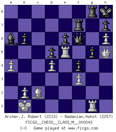 Last move : 1-0 2011 August 27 7:57:2 [Event "FICGS__CHESS__CLASS_M__000043"] [Site "FICGS"] [Date "2011.01.13"] [Round "1"] [White "Archer,J. Robert"] [Black "Nadanian,Ashot"] [Result "1-0"] [WhiteElo "2213"] [BlackElo "2257"] 1.e4 d5 2.exd5 Qxd5 3.Nc3 Qd6 4.d4 Nf6 5.Nf3 c6 6.Ne5 Nbd7 7.Nc4 Qc7 8.Qf3 Nb6 9.Bf4 Qd7 10.Nxb6 axb6 11.O-O-O Qd8 12.h3 e6 13.Bc4 b5 14.Bb3 Be7 15.Kb1 O-O 16.h4 Nd5 17.Be5 Qd7 18.h5 b6 19.Rhe1 b4 20.h6 g6 21.Ne4 f6 22.Bh2 Ba6 23.Qh3 Rae8 24.Nd2 Bd8 25.g4 Bc7 26.Ne4 g5 27.Bg3 Kh8 28.Qh1 Bf4 29.Qf3 Qd8 30.a3 Qe7 31.c4 bxc3 32.Nxc3 Qd6 33.Nxd5 cxd5 34.Bxf4 gxf4 35.g5 fxg5 36.Bc2 Rg8 37.Re5 Qf8 38.Rg1 Qf6 39.Qh5 Ref8 40.a4 Rf7 41.f3 1-0 Scandinavian : Pytel-Wade variation Queenside Castling by player White (move 11) Kingside Castling by player Black (move 15) Player White won this chess game. Follow this game move after move (download)Why must I lose to this idiot ? (Aron Nimzovich) Versuche, dich von der Sklaverei der Eröffnungsvarianten zu befreien. Stattdessen soll man gewisse Typenpositionen erlernen, die man eingehend analysiert. (Aaron Nimzowitsch) Sin errores no puede haber brillantez. (Emanuel Lasker) Mais l'homme est une créature légère et illogique : semblable au joueur d'échecs, il n'aime que le processus du but à atteindre, non le but lui-même. (Dostoïevsky) Hold em is to stud what chess is to checkers. (Johnny Moss)