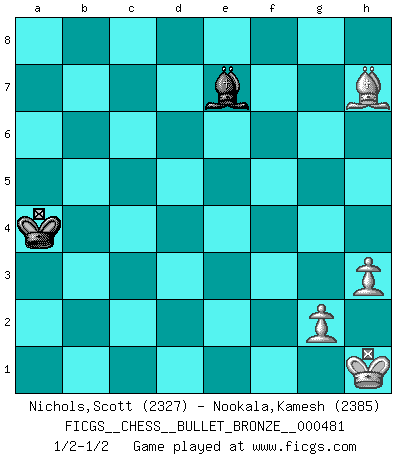 Last move : 1/2-1/2 2011 January 13 17:30:26 [Event "FICGS__CHESS__BULLET_BRONZE__000481"] [Site "FICGS"] [Date "2011.01.13"] [Round "1"] [White "Nichols,Scott"] [Black "Nookala,Kamesh"] [Result "1/2-1/2"] [WhiteElo "2327"] [BlackElo "2385"] 1.d4 d5 2.c4 c6 3.Nf3 Nf6 4.Nc3 e6 5.e3 Nbd7 6.Bd3 dxc4 7.Bxc4 b5 8.Bd3 Bb7 9.e4 b4 10.Na4 c5 11.e5 Nd5 12.O-O cxd4 13.Re1 g6 14.Bg5 Qa5 15.Nxd4 a6 16.a3 bxa3 17.bxa3 Bg7 18.Rb1 Rb8 19.Bd2 Qd8 20.Rxb7 Rxb7 21.Bxa6 Rc7 22.Ba5 Qb8 23.Bxc7 Qxc7 24.Nb5 Qb8 25.Nd6+ Ke7 26.Qd2 Qa8 27.Bb5 Nxe5 28.Nb6 Nxb6 29.Qb4 Nd5 30.Qc5 f6 31.f4 Nd7 32.Nf5+ Kd8 33.Qd6 Qa7+ 34.Kh1 gxf5 35.Qxe6 N7b6 36.Qd6+ Kc8 37.Rc1+ Kb7 38.Bc6+ Ka6 39.Qc5 Nc7 40.a4 Nbd5 41.Qc4+ Ka5 42.Bxd5 Rb8 43.h3 Bf8 44.Qxc7+ Qxc7 45.Rxc7 Bd6 46.Ra7+ Kb6 47.Rf7 Kc5 48.Bb7 Bxf4 49.Rxf6 Kb4 50.Rxf5 Bd6 51.Bf3 Kxa4 52.Be4 Rf8 53.Rxf8 Bxf8 54.Bxh7 Be7 1/2-1/2 QGD Slav : 4.Nc3 Kingside Castling by player White (move 12) 10 pieces endgame at move 50 : White KRBPPP , Black KRBP WHITE : King + 1 Rook 1 Bishop 3 Pawns BLACK : King + 1 Rook 1 Bishop 1 Pawn 9 pieces endgame at move 51 : White KRBPP , Black KRBP WHITE : King + 1 Rook 1 Bishop 2 Pawns BLACK : King + 1 Rook 1 Bishop 1 Pawn 8 pieces endgame at move 53 : White KRBPP , Black KBP WHITE : King + 1 Rook 1 Bishop 2 Pawns BLACK : King + 1 Bishop 1 Pawn 7 pieces endgame at move 53 : White KBPP , Black KBP WHITE : King + 1 Bishop 2 Pawns BLACK : King + 1 Bishop 1 Pawn 6 pieces endgame at move 54 : White KBPP , Black KB WHITE : King + 1 Bishop 2 Pawns BLACK : King + 1 Bishop This chess game ended in a draw. Follow this game move after move (download)When I asked Fischer why he had not played a certain move in our game, he replied: 'Well, you laughed when I wrote it down !' (Mikhail Tal) Wer sich die Fähigkeit anerziehen will im Schach selbstständig zu denken, der muß alles meiden, was leblos ist: ausgeklügelte Theorien, die sich auf sehr wenige Beispiele und eine Menge Hirngespinste stützen. (Emanuel Lasker) No existe un remordimiento como el remordimiento del Ajedrez. (H. G. Wells) J'ai vu le vaincu d'Echecs jouer des années durant dans l'espoir de la fête de la victoire. Car tu es plus riche de ce qu'elle existe si même elle n'est point pour toi. Ainsi de la perle du fond des mers. (Antoine de Saint-Exupéry) A cynic is a man who knows the price of everything but the value of nothing. (Oscar Wilde)