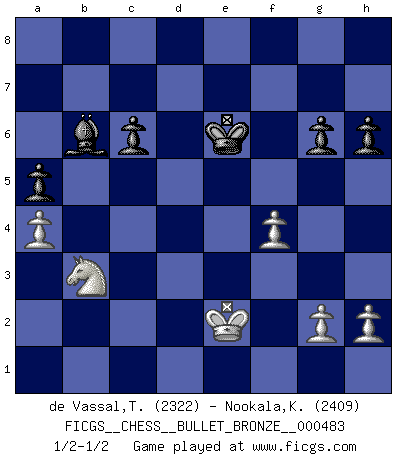 Last move : 1/2-1/2 2011 January 13 18:50:40 [Event "FICGS__CHESS__BULLET_BRONZE__000483"] [Site "FICGS"] [Date "2011.01.13"] [Round "1"] [White "de Vassal,Thibault"] [Black "Nookala,Kamesh"] [Result "1/2-1/2"] [WhiteElo "2322"] [BlackElo "2409"] 1.d4 Nf6 2.c4 e6 3.Nf3 d5 4.Nc3 c6 5.Bg5 h6 6.Bxf6 Qxf6 7.e3 Nd7 8.Qc2 g6 9.a4 Bg7 10.Bd3 Qe7 11.O-O a5 12.Rfe1 dxc4 13.Bxc4 O-O 14.Rad1 Qb4 15.Bb3 Rb8 16.e4 e5 17.Na2 Qb6 18.Nc1 exd4 19.e5 Nc5 20.Nxd4 Nxb3 21.Ncxb3 Re8 22.e6 Bxe6 23.Nxe6 Rxe6 24.Rxe6 fxe6 25.Nc5 Rd8 26.Rxd8+ Qxd8 27.Nxb7 Qb6 28.Nc5 Qxb2 29.Qxb2 Bxb2 30.Nxe6 Bf6 31.Kf1 Kf7 32.Nc5 Bd4 33.Nb3 Bb6 34.Ke2 Ke6 35.f4 1/2-1/2 Queen's pawn game Kingside Castling by player White (move 11) Kingside Castling by player Black (move 13) This chess game ended in a draw. Follow this game move after move (download)I give 98 percent of my mental energy to Chess. Others give only 2 percent. (Bobby Fischer) Schach ist wie eine schöne Frau, zu der wir ständig zurückkehren, gleichviel, wie oft sie uns zurückweist. (Anonymous) El arma más poderosa en el Ajedrez, es tener la próxima movida. (David Bronstein) Mais n'est-ce pas déjà le limiter injurieusement que d'appeler les échecs un jeu? N'est-ce pas aussi une science, un art, ou quelque chose qui, comme le cercueil de Mahomet entre ciel et terre, est suspendu entre l'un et l'autre, et qui réunit un nombre incroyable de contraires ? (Stefan Zweig) Don't be irreplaceable, if you can't be replaced, you can't be promoted. (Dan Rotaru)