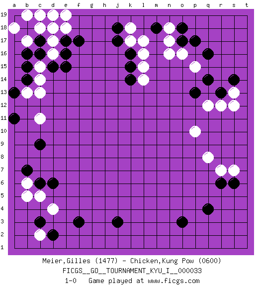 Last move : 1-0 2011 January 20 19:34:32 [Event "FICGS__GO__TOURNAMENT_KYU_I__000033"] [Site "FICGS"] [Date "2011.01.13"] [Round "1"] [Black "Meier,Gilles"] [White "Chicken,Kung Pow"] [Result "1-0"] [Rating 1 "1477"] [Rating 2 "0600"] 1.q16 d4 2.q4 d16 3.f3 o16 4.o17 n17 5.p17 n16 6.q14 p15 7.c6 c5 8.d6 b5 9.c9 c11 10.f17 q8 11.r6 r7 12.s6 s7 13.j3 p10 14.j17 k17 15.k16 l17 16.k15 l16 17.c17 d17 18.c16 c15 19.b15 c18 20.d15 c14 21.b14 c13 22.e15 b17 23.b16 a18 24.d18 e18 25.d19 e19 26.e17 c19 27.d18 d19 28.e16 d18 29.o3 b19 30.d2 c2 31.c3 b6 32.b7 r12 33.p13 q12 34.s14 s13 35.r13 s12 36.o18 n18 37.j18 k18 38.m18 l15 39.k14 l14 40.a11 b13 41.a13 1-0 Here are the names of the openings (joseki) played in the four corners : Corner d4 : d4 f3 Hoshi (Hwajeom, Seongjeom, Xingwei`) 4-4 Point. The star or hoshi (4-4) point, emphasizing influence at the potential expense of territory. Ikken Kakari (Hankan Keolch'im, Yi Gua`jiao~, 1-Space Low Approach). Black 2 is the standard approach move to the 4-4. Corner q16 : q16 o16 Hoshi (Hwajeom, Seongjeom, Xingwei`) 4-4 Point. The star or hoshi (4-4) point, emphasizing influence at the potential expense of territory. Ikken Takagakari (Hankan Nop'dakeolch'im, Yi Gaojia, 1-Space High Approach). Black typically responds at 6-4 or 3-10. Black 4-10 is played when Black finds play on the right side advantageous. Black 4-8 or 3-8 may be played when Black has support at top. Corner q4 : q4 q8 Hoshi (Hwajeom, Seongjeom, Xingwei`) 4-4 Point. The star or hoshi (4-4) point, emphasizing influence at the potential expense of territory. Player Black won this Go (weiqi, baduk) game. Follow this game move after move (download)Do not make moves that strengthen your opponent ! (Anonymous) Knowledge rests not upon truth alone, but upon error also. (Carl G. Jung)