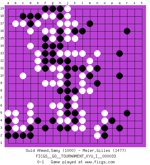 Last move : 0-1 2011 May 8 10:40:39 [Event "FICGS__GO__TOURNAMENT_KYU_I__000033"] [Site "FICGS"] [Date "2011.01.13"] [Round "1"] [Black "Ould Ahmed,Samy"] [White "Meier,Gilles"] [Result "0-1"] [Rating 1 "1000"] [Rating 2 "1477"] 1.r16 d4 2.q3 d16 3.f17 d14 4.f3 d6 5.h16 k17 6.m17 k15 7.k16 j16 8.l16 h17 9.h15 j15 10.d17 c17 11.d18 g16 12.g17 f16 13.h18 j17 14.c18 b17 15.f19 j18 16.h19 j19 17.h14 g18 18.g19 e17 19.e18 f18 20.q10 o4 21.r5 l3 22.h3 l5 23.o3 n3 24.o2 n2 25.p4 o5 26.d3 c3 27.d2 l13 28.k4 l4 29.c2 b3 30.b2 g6 31.e4 d5 32.a3 b4 33.a4 a5 34.a2 b5 35.h12 c10 36.j6 j4 37.j3 k3 38.k5 h5 39.j9 l9 40.n9 m8 41.l11 n13 42.q13 m11 43.m10 l10 44.n11 m12 45.k11 f9 46.f11 h10 47.j10 h11 48.j11 j13 49.j12 h9 50.j8 k7 51.j7 k6 52.j5 h4 53.g4 h6 54.f14 e13 55.f13 e12 56.f12 h13 57.g13 g11 58.g12 e11 59.f15 g15 60.g14 k13 61.h8 g9 62.k8 l8 0-1 Here are the names of the openings (joseki) played in the four corners : Corner d16 : d16 f17 Hoshi (Hwajeom, Seongjeom, Xingwei`) 4-4 Point. The star or hoshi (4-4) point, emphasizing influence at the potential expense of territory. Ikken Kakari (Hankan Keolch'im, Yi Gua`jiao~, 1-Space Low Approach). Black 2 is the standard approach move to the 4-4. Corner d4 : d4 f3 Hoshi (Hwajeom, Seongjeom, Xingwei`) 4-4 Point. The star or hoshi (4-4) point, emphasizing influence at the potential expense of territory. Ikken Kakari (Hankan Keolch'im, Yi Gua`jiao~, 1-Space Low Approach). Black 2 is the standard approach move to the 4-4. Corner q4 : q3 o4 Komoku (Somok, Xiao~mu`) 3-4 Point. The komoku (3-4) point is the traditional corner enclosure move.. Player White won this Go (weiqi, baduk) game. Follow this game move after move (download)Error is one of the sources of transformation. (Pierre Audouard) Men never do evil so completely and cheerfully as when they do it from religious conviction. (Blaise Pascal)