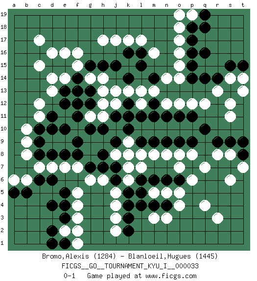 Last move : 0-1 2011 May 21 9:21:26 [Event "FICGS__GO__TOURNAMENT_KYU_I__000033"] [Site "FICGS"] [Date "2011.01.13"] [Round "1"] [Black "Bromo,Alexis"] [White "Blanloeil,Hugues"] [Result "0-1"] [Rating 1 "1284"] [Rating 2 "1445"] 1.q16 d16 2.d4 q4 3.k4 k17 4.q10 o17 5.p17 o16 6.p16 o15 7.p15 q7 8.o6 o4 9.n4 n3 10.d10 d13 11.e12 c11 12.d11 c12 13.c10 q12 14.q14 o12 15.n11 n12 16.m12 m13 17.k14 l13 18.k12 l12 19.m11 k13 20.l11 j12 21.k11 h13 22.f13 g14 23.f14 f15 24.g13 h14 25.j11 h11 26.h10 g11 27.g10 f3 28.e3 f4 29.e4 f5 30.e5 j3 31.k3 j4 32.k5 j5 33.j6 j2 34.k2 h6 35.h7 g6 36.g7 c7 37.c6 d7 38.d6 f10 39.f11 f7 40.f8 e7 41.e8 n5 42.m4 o5 43.n6 m5 44.m6 p8 45.p9 o8 46.o9 n8 47.n9 m8 48.m9 k6 49.j7 l7 50.l6 k7 51.k8 m3 52.l4 l8 53.l9 j8 54.h8 k9 55.j9 k8 56.k10 c17 57.e15 e16 58.d15 c15 59.f12 h12 60.g15 f16 61.h15 e14 62.e10 s12 63.s13 r13 64.r14 s14 65.s15 t13 66.t15 r8 67.r9 s8 68.s9 r3 69.d8 b6 70.b5 a6 71.a5 b8 72.c8 b9 73.c9 b10 74.f9 e2 75.d2 f2 76.e1 f1 77.d1 o18 78.p18 p19 79.q19 o19 80.q18 o14 81.p14 p12 82.o11 s11 83.e13 d14 84.p11 t14 85.j15 h17 86.g12 j13 87.k16 j17 88.l15 m16 89.l16 l17 90.m14 n14 91.t8 t7 92.t9 s6 93.p7 p6 94.l5 o7 0-1 Here are the names of the openings (joseki) played in the four corners : Corner q16 : q16 o17 Hoshi (Hwajeom, Seongjeom, Xingwei`) 4-4 Point. The star or hoshi (4-4) point, emphasizing influence at the potential expense of territory. Ikken Kakari (Hankan Keolch'im, Yi Gua`jiao~, 1-Space Low Approach). White 2 is the standard approach move to the 4-4. Corner d4 : d4 f3 Hoshi (Hwajeom, Seongjeom, Xingwei`) 4-4 Point. The star or hoshi (4-4) point, emphasizing influence at the potential expense of territory. Ikken Kakari (Hankan Keolch'im, Yi Gua`jiao~, 1-Space Low Approach). White 2 is the standard approach move to the 4-4. Player White won this Go (weiqi, baduk) game. Follow this game move after move (download)To invade, need 20 points in open area; otherwise, keshi is best. (Yang Yilun, 7p) Even the best needles are not sharp at both ends. (Chinese proverb)