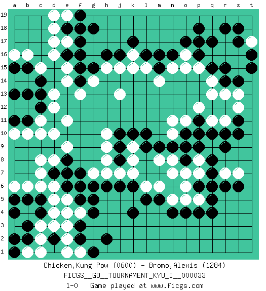 Last move : 1-0 2011 September 3 9:2:58 [Event "FICGS__GO__TOURNAMENT_KYU_I__000033"] [Site "FICGS"] [Date "2011.01.13"] [Round "1"] [Black "Chicken,Kung Pow"] [White "Bromo,Alexis"] [Result "1-0"] [Rating 1 "0600"] [Rating 2 "1284"] 1.q17 d4 2.q4 d16 3.k4 k16 4.q10 d10 5.k10 h7 6.j8 j13 7.g4 f4 8.f3 e3 9.f5 e4 10.f2 e2 11.l16 l15 12.m16 n15 13.m15 m14 14.n16 o16 15.o17 o15 16.p16 p15 17.k17 k15 18.j16 j15 19.h16 h15 20.g15 g14 21.f15 e15 22.f14 f13 23.e16 e14 24.f16 e17 25.f17 q16 26.p17 r17 27.r18 r16 28.s17 s16 29.p18 t17 30.s18 e5 31.g6 f6 32.g5 g7 33.h6 j7 34.j6 k7 35.k6 l6 36.l5 m6 37.m5 n5 38.n4 o5 39.o4 p5 40.q5 q6 41.r6 r7 42.s6 s7 43.p4 k9 44.p6 o6 45.q7 p7 46.q6 o7 47.r9 f18 48.e18 d17 49.g18 d18 50.f19 d19 51.r14 q13 52.q15 q14 53.r15 s15 54.s14 r13 55.t15 s13 56.t16 f1 57.g1 e1 58.h2 e19 59.f18 r11 60.q8 p8 61.p9 o9 62.o10 n10 63.p11 o11 64.p10 p12 65.n9 n8 66.o8 n7 67.o9 n11 68.m9 m8 69.l9 k8 70.j9 h8 71.j10 h9 72.l10 h10 73.c12 c11 74.b11 b10 75.d11 c10 76.b13 d12 77.c13 e11 78.a11 d13 79.c14 c15 80.b15 b16 81.a15 a16 82.a13 a10 83.c5 c6 84.c4 b4 85.b5 b6 86.b3 c3 87.a4 c2 88.b2 b1 89.a2 a6 90.a5 c1 91.d2 d3 92.e6 d6 93.f7 e7 94.f6 d5 95.d7 c7 96.e8 d8 97.e7 e9 98.a1 c8 99.r10 q11 100.s11 s12 101.s10 1-0 Here are the names of the openings (joseki) played in the four corners : Corner q4 : q4 l6 Hoshi (Hwajeom, Seongjeom, Xingwei`) 4-4 Point. The star or hoshi (4-4) point, emphasizing influence at the potential expense of territory. Player Black won this Go (weiqi, baduk) game. Follow this game move after move (download)Very few good moves are played. (Pierre Audouard) Indecision is the key to flexibility. (Unknown)