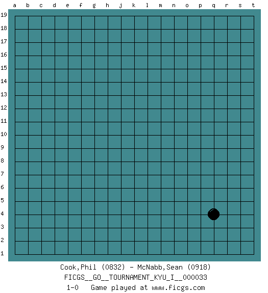 Last move : 1-0 2011 February 23 11:3:11 [Event "FICGS__GO__TOURNAMENT_KYU_I__000033"] [Site "FICGS"] [Date "2011.01.13"] [Round "1"] [Black "Cook,Phil"] [White "McNabb,Sean"] [Result "1-0"] [Rating 1 "0832"] [Rating 2 "0918"] 1.q4 1-0 This go game has been lost on time (started : 2011.01.13 20:11:14) Here are the names of the openings (joseki) played in the four corners : Corner q4 : q4 1-0 Hoshi (Hwajeom, Seongjeom, Xingwei`) 4-4 Point. The star or hoshi (4-4) point, emphasizing influence at the potential expense of territory. Player Black won this Go (weiqi, baduk) game. Follow this game move after move (download)Strike at the waist of the knight's move. (Anonymous) The only thing that overcomes hard luck is hard work. (Harry Golden)