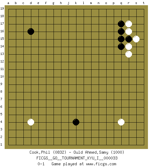 Last move : 0-1 2011 April 1 18:55:55 [Event "FICGS__GO__TOURNAMENT_KYU_I__000033"] [Site "FICGS"] [Date "2011.01.13"] [Round "1"] [Black "Cook,Phil"] [White "Ould Ahmed,Samy"] [Result "0-1"] [Rating 1 "0832"] [Rating 2 "1000"] 1.q16 d4 2.d16 q4 3.k4 r14 4.q14 r16 5.r15 s15 6.q15 r17 7.q17 r13 0-1 Here are the names of the openings (joseki) played in the four corners : Corner q16 : q16 r14 Hoshi (Hwajeom, Seongjeom, Xingwei`) 4-4 Point. The star or hoshi (4-4) point, emphasizing influence at the potential expense of territory. Ikken Kakari (Hankan Keolch'im, Yi Gua`jiao~, 1-Space Low Approach). White 2 is the standard approach move to the 4-4. Corner q4 : q4 0-1 Hoshi (Hwajeom, Seongjeom, Xingwei`) 4-4 Point. The star or hoshi (4-4) point, emphasizing influence at the potential expense of territory. Player White won this Go (weiqi, baduk) game. Follow this game move after move (download)Go is to western chess what philosophy is to double entry accounting. (from Shibumi, by Trevanian) Some people are so afraid to die that they never begin to live. (Henry Van Dyke)