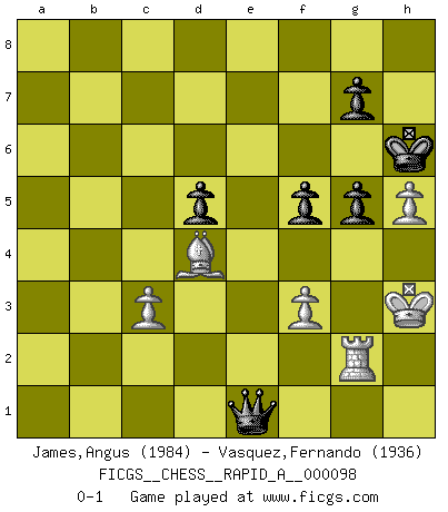 Last move : 0-1 2011 June 2 15:58:21 [Event "FICGS__CHESS__RAPID_A__000098"] [Site "FICGS"] [Date "2011.01.14"] [Round "1"] [White "James,Angus"] [Black "Vasquez,Fernando"] [Result "0-1"] [WhiteElo "1984"] [BlackElo "1936"] 1.e4 e5 2.Nf3 Nf6 3.Nxe5 d6 4.Nf3 Nxe4 5.Nc3 Nxc3 6.dxc3 Be7 7.Be3 O-O 8.Qd2 Re8 9.O-O-O Nc6 10.h4 Bf5 11.Kb1 Qd7 12.Bc4 h6 13.h5 Rad8 14.Bd5 Bg4 15.Qd3 Bf6 16.Be4 b5 17.a3 a5 18.Qd5 Rxe4 19.Qxe4 b4 20.axb4 axb4 21.cxb4 Rb8 22.Nd4 Nxb4 23.f3 d5 24.Qxg4 Qa4 25.Qf5 c5 26.c3 Qa2+ 27.Kc1 cxd4 28.Rxd4 Bxd4 29.Bxd4 Nd3+ 30.Kd2 Rxb2+ 31.Kxd3 Rd2+ 32.Ke3 Re2+ 33.Kf4 Qd2+ 34.Kg4 Rxg2+ 35.Kh3 Rg5 36.Qc8+ Kh7 37.Qg4 f5 38.Qxg5 hxg5 39.Rg1 Kh6 40.Rg2 Qe1 0-1 Petrov : Nimzovich attack Kingside Castling by player Black (move 7) Queenside Castling by player White (move 9) Player Black won this chess game. Follow this game move after move (download)Avoid the crowd. Do your own thinking independently. Be the Chess player, not the Chess piece. (Ralph Charell) Kein Großmeister ist normal. Sie unterscheiden sich nur im Ausmaß Ihrer Verrücktheit. (Viktor Kortschnoi) La táctica fluye a partir de una posición superior. (Bobby Fischer) Des points faibles ou des trous dans la position de l'adversaire doivent être occupés par des pièces et non pas par des pions. (Siegbert Tarrasch) Chess, like love, like music, has the power to make people happy. (Siegbert Tarrasch)