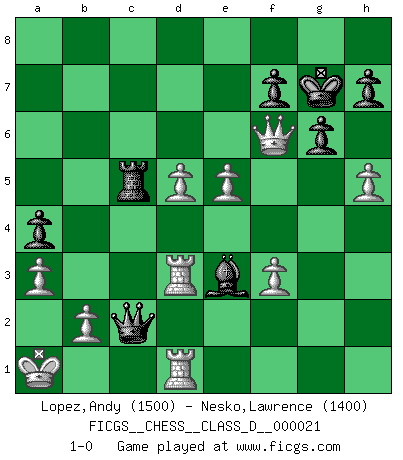 Last move : 1-0 2007 January 21 20:41:27 [Event "FICGS__CHESS__CLASS_D__000021"] [Site "FICGS"] [Date "2006.12.06"] [Round "1"] [White "Lopez,Andy"] [Black "Nesko,Lawrence"] [Result "1-0"] [WhiteElo "1500"] [BlackElo "1400"] 1.Nf3 d5 2.d4 g6 3.c4 Nf6 4.cxd5 Bg7 5.Qa4 Bd7 6.Qb3 b6 7.Nc3 O-O 8.e4 e6 9.Bg5 Qe8 10.Be2 exd5 11.e5 Ne4 12.Nxd5 Nxg5 13.Nxc7 Nxf3+ 14.Bxf3 Qd8 15.Nxa8 Bc6 16.Rd1 Bxf3 17.Qxf3 Nd7 18.Qc6 Qxa8 19.Qxd7 Qxg2 20.Rf1 Qe4+ 21.Kd2 Bh6+ 22.Kc3 Bg5 23.f3 Qe3+ 24.Rd3 Qe2 25.Rfd1 a5 26.Qc6 b5 27.a3 Bh4 28.Qxb5 Rc8+ 29.Kb3 a4+ 30.Ka2 Bg5 31.h4 Bc1 32.Kb1 Qc2+ 33.Ka1 Kg7 34.h5 Rc6 35.d5 Rc5 36.Qb6 Be3 37.Qf6+ 1-0 Reti Opening Kingside Castling by player Black (move 7) Player White won this chess game. Follow this game move after move (download)The most important feature of the Chess position is the activity of the pieces. This is absolutely fundamental in all phases of the game: Opening, Middlegame and especially Endgame. The primary constraint on a piece's activity is the Pawn structure. (Michael Stean) Die unerbitterlichsten Regeln im Schach sind die Ausnahmen. (Savielly Grigorievitsch Tartakower) Preferería tener un Peón que un dedo. (Reuben Fine) Dans le domaine de la peinture, de la gravure et de la sculpture, dès la première décennie de notre siècle, les artistes abandonnent la représentation de la partie d'échecs pour se concentrer sur les pièces, sur les échiquiers et sur toutes les variations auxquelles les unes et les autres peuvent donner lieu. On passe en quelque sorte d'un thème social à un thème musical (au sens de la musica médiévale, c'est-à-dire d'une notion qui inclue le rythme, l'harmonie, la construction et la déconstruction, etc.). Graphiquement et picturalement, l'échiquier apparaît comme une structure ouverte, dynamique, d'une richesse infinie, autorisant toutes les combinatoires et débouchant sur des mouvements et des rythmes de nature exponentielle. (Michel Pastoureau) The mind is like a parachute, it only functions when its open. (Unknown)