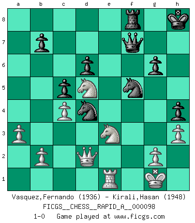 Last move : 1-0 2011 June 5 7:13:49 [Event "FICGS__CHESS__RAPID_A__000098"] [Site "FICGS"] [Date "2011.01.14"] [Round "1"] [White "Vasquez,Fernando"] [Black "Kirali,Hasan"] [Result "1-0"] [WhiteElo "1936"] [BlackElo "1948"] 1.e4 e5 2.Nf3 Nf6 3.Nc3 Nc6 4.Bb5 Bb4 5.O-O O-O 6.d3 d6 7.Be3 Be6 8.Nd2 Nd4 9.Bc4 c6 10.a3 Bc5 11.h3 a5 12.Bxe6 Nxe6 13.Qf3 Bxe3 14.fxe3 a4 15.Na2 Qe7 16.Nb4 Kh8 17.Rf2 Qc7 18.Nf1 Rad8 19.c4 Nd7 20.Ng3 Ndc5 21.Raf1 Qd7 22.Qg4 Qe8 23.Rd1 Nb3 24.Nf5 f6 25.Na2 Nbc5 26.Nc3 g6 27.Ng3 h5 28.Qe2 Rd7 29.d4 Nb3 30.Nxa4 h4 31.Nf1 exd4 32.exd4 Nbxd4 33.Qe3 c5 34.Nb6 Rdf7 35.Nd5 f5 36.exf5 Rxf5 37.Rxf5 Nxf5 38.Qd2 Qf7 39.Re1 Ned4 40.Nfe3 1-0 This chess game has been lost on time (started : 2011.01.14 4:55:45) Petrov Three knights game Kingside Castling by player White (move 5) Kingside Castling by player Black (move 5) Player White won this chess game. Follow this game move after move (download)Chess books should be used as we use glasses: to assist the sight, although some players make use of them as if they thought they conferred sight. (Jose Raul Capablanca) Alles was am Schachbrett zählt sind gute Züge. (Robert James Fischer) Diferente gente reacciona diferentemente en aceptar la derrota. (Bobby Fischer) Je fais ceci parce que dans cinquante coups j'obtiendrai cela; je m'appelle Mikhail Moisevitch Botvinnik. (Botvinnik) Who needs drugs and alcohol if he can play Big Chess at FICGS ? (Heinz-Georg Lehnhoff)