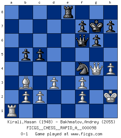Last move : 0-1 2011 March 29 1:51:26 [Event "FICGS__CHESS__RAPID_A__000098"] [Site "FICGS"] [Date "2011.01.14"] [Round "1"] [White "Kirali,Hasan"] [Black "Bakhmatov,Andrey"] [Result "0-1"] [WhiteElo "1948"] [BlackElo "2055"] 1.e4 e5 2.Nf3 Nc6 3.Bb5 a6 4.Ba4 Nf6 5.O-O b5 6.Bb3 Be7 7.Re1 O-O 8.h3 Bb7 9.d3 d5 10.exd5 Nxd5 11.Nxe5 Nxe5 12.Rxe5 Qd6 13.Re1 Rae8 14.Nd2 Nf6 15.Nf3 c5 16.Bg5 Bd8 17.Rxe8 Rxe8 18.Bh4 Qe7 19.a4 Bc7 20.Qf1 Bxf3 21.gxf3 Bf4 22.axb5 axb5 23.Kh1 Kf8 24.Qg2 Qd6 25.Bg5 g6 26.Bxf4 Qxf4 27.Qg3 Qf5 28.Kg1 Nh5 29.Qg4 Qf6 30.h4 Nf4 31.Kh2 Kg7 0-1 This chess game has been lost on time (started : 2011.01.14 4:55:45) Ruy Lopez : 5.O-O Kingside Castling by player White (move 5) Kingside Castling by player Black (move 7) Player Black won this chess game. Follow this game move after move (download)You know you're going to lose. Even when I was ahead I knew I was going to lose. - On playing against Fischer. (Andrew Soltis) Ich war zu klein für die Schach-Schülermannschaft! (Woody Allen) No hay un Gran Maestro de Ajedrez que sea normal; solo se diferencían ellos por la magnitud de su locura. (Viktor Korchnoi) Comme les marins qui ont mille raisons différentes d'aller en mer, les joueurs d'échecs en ont tout autant avant de s'installer devant une table et jouer... (Vincent Bertignac, philosophe) Art is the triumph over chaos. (John Cheever)
