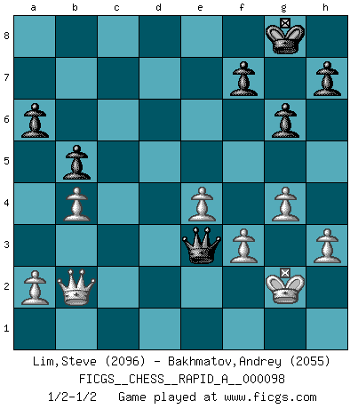 Last move : 1/2-1/2 2011 March 6 3:32:4 [Event "FICGS__CHESS__RAPID_A__000098"] [Site "FICGS"] [Date "2011.01.14"] [Round "1"] [White "Lim,Steve"] [Black "Bakhmatov,Andrey"] [Result "1/2-1/2"] [WhiteElo "2096"] [BlackElo "2055"] 1.d4 Nf6 2.c4 e6 3.Nf3 b6 4.g3 Ba6 5.Qa4 c5 6.Bg2 Bb7 7.O-O cxd4 8.Nxd4 Bxg2 9.Kxg2 Qc7 10.Nc3 Be7 11.f3 a6 12.Rd1 Ra7 13.Qb3 Rb7 14.e4 O-O 15.Be3 d6 16.Rac1 Nbd7 17.Qa3 Ra7 18.Nd5 exd5 19.cxd5 Qb7 20.Nc6 Re8 21.Bf4 Nc5 22.b4 Ncd7 23.Nxa7 Qxa7 24.Rc6 Nh5 25.Bxd6 Bxd6 26.Rxd6 Ne5 27.Qc3 Qb8 28.Rc6 Nxc6 29.dxc6 Qc8 30.c7 g6 31.Rd6 b5 32.Rb6 Qd7 33.Rb8 Rc8 34.Qe5 Qd2+ 35.Kh3 Qd7+ 36.g4 Nf6 37.Rxc8+ Qxc8 38.Qxf6 Qxc7 39.Qb2 Qc4 40.Kg2 Qd3 41.h3 Qe3 1/2-1/2 Queen's Indian : Nimzovich variation (exaggerated Fianchetto) Kingside Castling by player White (move 7) Kingside Castling by player Black (move 14) This chess game ended in a draw. Follow this game move after move (download)When you don't know what to do, wait for your opponent to get an idea - it's sure to be wrong. (Tarrasch) Es ist peinlich, dass ich nie Weltmeister wurde. Es wäre leicht, Leonid Breschnjew als Ursache vorzuschieben, dessen Apparat den Vorzeigekommunisten Anatoli Karpow in allem unterstützte. Aber Garri Kasparow zum Beispiel, der ebenfalls von den Sowjets unerwünscht war, hat trotz der Widerstände den WM-Titel erobert. (Viktor Kortschnoi) El Ajedrez es de 30 a 40 por ciento psicología. Uno no cuenta con esto cuando se juega contra una computadora. No lo puedo confundir. (Judith Polgar) Shah mat. Le roi est mort. Cri de fierté d'un joueur venant de terrasser son adversaire, courtoisement, sans effusion de sang. No, no, you're not thinking; you're just being logical. (Niels Bohr)