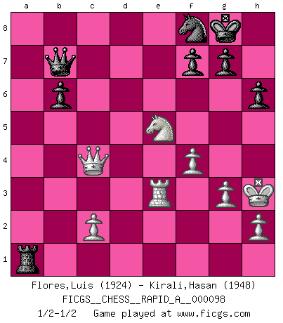 Last move : 1/2-1/2 2011 April 6 20:53:47 [Event "FICGS__CHESS__RAPID_A__000098"] [Site "FICGS"] [Date "2011.01.14"] [Round "1"] [White "Flores,Luis"] [Black "Kirali,Hasan"] [Result "1/2-1/2"] [WhiteElo "1924"] [BlackElo "1948"] 1.e4 e5 2.Nf3 Nf6 3.Nxe5 d6 4.Nf3 Nxe4 5.d4 d5 6.Bd3 Nc6 7.O-O Be7 8.Nc3 Bf5 9.Re1 Nxc3 10.bxc3 Bxd3 11.Qxd3 O-O 12.c4 Re8 13.Bd2 dxc4 14.Qxc4 Bd6 15.a4 h6 16.a5 Rxe1+ 17.Rxe1 Ne7 18.Qd3 c5 19.Qe4 b6 20.dxc5 Bxc5 21.Be3 Bxe3 22.Rxe3 Ng6 23.axb6 axb6 24.g3 Nf8 25.Ne5 Ra1+ 26.Kg2 Qd1 27.Qc4 Qh1+ 28.Kh3 Qb7 29.f4 1/2-1/2 Petrov : Classical attack Kingside Castling by player White (move 7) Kingside Castling by player Black (move 11) This chess game ended in a draw. Follow this game move after move (download)My opponents make good moves too. Sometimes I don't take these things into consideration. (Bobby Fischer) Es ist im Leben wie im Schachspiel. Wir entwerfen einen Plan, dieser bleibt jedoch bedingt durch das, was im Schachspiel dem Gegner, im Leben dem Schicksal zu tun belieben wird. (Arthur Schopenhauer) Con el tiempo, empecé a progresar en partidas decisivas. Tal vez porque me di cuenta de una simple verdad: no solo estaba yo nervioso sino también mi oponente. (Mikhail Tal) Avec des compensations pour le matériel en plus... (Anonyme) First of all, we have to go back to the classical time control. (Anatoly Karpov)
