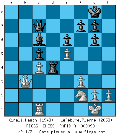 Last move : 1/2-1/2 2011 May 19 11:17:21 [Event "FICGS__CHESS__RAPID_A__000098"] [Site "FICGS"] [Date "2011.01.14"] [Round "1"] [White "Kirali,Hasan"] [Black "Lefebvre,Pierre"] [Result "1/2-1/2"] [WhiteElo "1948"] [BlackElo "2053"] 1.e4 c5 2.Nf3 e6 3.d4 cxd4 4.Nxd4 a6 5.Nc3 Qc7 6.Be2 b5 7.O-O Bb7 8.Re1 Nc6 9.Nxc6 dxc6 10.e5 Rd8 11.Bd3 c5 12.Qg4 Ne7 13.Bg5 Rd4 14.Qg3 Ng6 15.Rad1 Be7 16.Bxg6 hxg6 17.Bxe7 Qxe7 18.Ne2 Rd7 19.f3 Qd8 20.Rxd7 Qxd7 21.Qf4 O-O 22.Nc3 Qc7 23.a3 Qa5 24.Qe3 b4 25.Nd1 Rc8 26.c4 Rd8 27.Nf2 Rd4 28.axb4 Qxb4 29.b3 a5 30.Rc1 a4 31.bxa4 Qxa4 32.Qc3 Qa2 33.Qc2 Qa5 34.Qc3 Qc7 35.Qb3 Bc6 1/2-1/2 Sicilian : Kan, 5.Nc3 Kingside Castling by player White (move 7) Kingside Castling by player Black (move 21) This chess game ended in a draw. Follow this game move after move (download)Of all my Russian books, the defense contains and diffuses the greatest 'warmth' which may seem odd seeing how supremely abstract Chess is supposed to be. (Vladimir Nabokov) Die westlichen Werte sind eine Sprache, welche die Putin-Administration nicht versteht. (Garry Kasparov) El Ajedrez se juega con la mente... ¡no con las manos!. (Renaud y Kahn) Mais n'est-ce pas déjà le limiter injurieusement que d'appeler les échecs un jeu? N'est-ce pas aussi une science, un art, ou quelque chose qui, comme le cercueil de Mahomet entre ciel et terre, est suspendu entre l'un et l'autre, et qui réunit un nombre incroyable de contraires ? (Stefan Zweig) I have opinions of my own - strong opinions - but I don't always agree with them. (George Bush)
