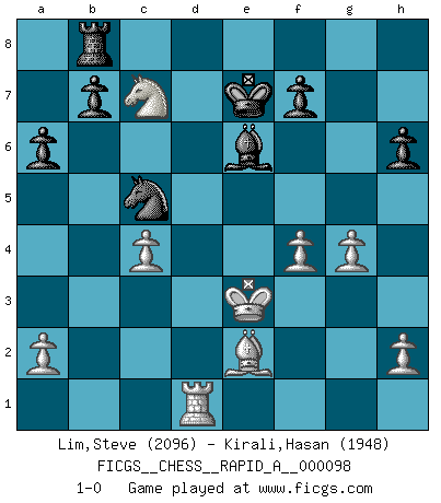 Last move : 1-0 2011 April 26 4:20:37 [Event "FICGS__CHESS__RAPID_A__000098"] [Site "FICGS"] [Date "2011.01.14"] [Round "1"] [White "Lim,Steve"] [Black "Kirali,Hasan"] [Result "1-0"] [WhiteElo "2096"] [BlackElo "1948"] 1.e4 e5 2.Nf3 Nf6 3.Nxe5 d6 4.Nf3 Nxe4 5.d4 d5 6.Bd3 Nc6 7.O-O Be7 8.c4 Nb4 9.Be2 O-O 10.Nc3 Be6 11.cxd5 Nxc3 12.bxc3 Nxd5 13.Bd2 Nf6 14.Bd3 c5 15.Re1 cxd4 16.Nxd4 Bd5 17.Bg5 h6 18.Bxh6 gxh6 19.Qd2 Ng4 20.Qe2 Nf6 21.Qe3 Ng4 22.Qxe7 Re8 23.Qxe8+ Qxe8 24.Rxe8+ Rxe8 25.f3 Nf6 26.c4 Be6 27.Be2 Nd7 28.Nb5 Rd8 29.Rd1 Kf8 30.f4 Ke7 31.Kf2 Rg8 32.g3 Nc5 33.Ke3 a6 34.Nc7 Rb8 35.g4 1-0 This chess game has been lost on time (started : 2011.01.14 4:55:45) Petrov : Classical attack Kingside Castling by player White (move 7) Kingside Castling by player Black (move 9) Player White won this chess game. Follow this game move after move (download)The most powerful weapon in Chess is to have the next move. (David Bronstein) Warum muß ich gegen diesen IDIOTEN verlieren? (Aaron Nimzowitsch) Yo no creo en la psicología. Yo creo en las buenas movidas. (Bobby Fischer) Vous m'avez demandé de vous exposer quel est le fondement de la prière. Je ne fais que préparer les pièces du jeu sur la table... Nous sera-t-il permis d'en adopter les règles et si nous les appliquons scrupuleusement nous ne tarderons pas à faire mat le Roi divin ! Il ne pourra échapper à nos mains. (Sainte Thérèse d'Avila, Chemin de perfection) Begin at the beginning and go on till you come to the end; then stop. (Lewis Carrol, Alice in Wonderland)