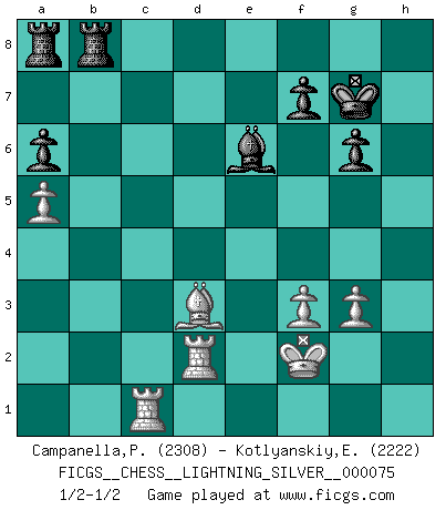 Last move : 1/2-1/2 2011 January 15 0:33:13 [Event "FICGS__CHESS__LIGHTNING_SILVER__000075"] [Site "FICGS"] [Date "2011.01.14"] [Round "1"] [White "Campanella,Paul"] [Black "Kotlyanskiy,Edward"] [Result "1/2-1/2"] [WhiteElo "2308"] [BlackElo "2222"] 1.e4 c5 2.Nc3 d6 3.Nf3 Nf6 4.d4 cxd4 5.Nxd4 a6 6.f3 e5 7.Nb3 Be6 8.Be3 h5 9.Qd2 Nbd7 10.Nd5 Nxd5 11.exd5 Bf5 12.Be2 Be7 13.Na5 Qc7 14.Rc1 Bh4+ 15.g3 Bd8 16.b4 Bh3 17.c4 Qb8 18.c5 Bxa5 19.bxa5 dxc5 20.d6 b6 21.Kf2 Be6 22.a4 bxa5 23.Qxa5 Qxd6 24.Rhd1 Qb8 25.Bxc5 Nxc5 26.Qxc5 h4 27.Rb1 Qc8 28.Qxe5 O-O 29.Bd3 Re8 30.Rbc1 Qb8 31.Qxb8 Rexb8 32.Rd2 hxg3+ 33.hxg3 g6 34.a5 Kg7 1/2-1/2 Sicilian : Closed Kingside Castling by player Black (move 28) This chess game ended in a draw. Follow this game move after move (download)An attack on the wing should be met by play in the center. (Nimzovitch) Garry Kasparov war erst in der Großmeister-Organisation GMA, dann in der Profischach-Vereinigung PCA, zum Schluss kehrte er wieder in den Schoß der FIDE zurück. Aber gut, manche Leute sind flexibel (Viswanathan Anand) Muchos jugadores de Ajedrez se sorprendían cuando después de la partida, Fischer explicaba con calma: 'Yo ya había analizado esta posibilidad' en una posición en la cual yo creía que no era posible de prever desde la apertura. (Mikhail Tal) RxDa4 pat (...) He who fights with monsters should be careful lest he thereby become a monster. (Friedrich Nietzsche, Beyond Good and Evil)
