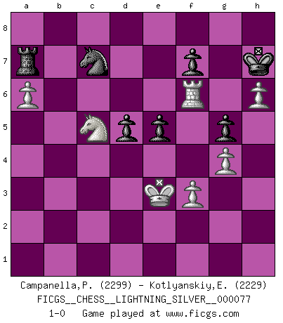 Last move : 1-0 2011 January 15 22:26:12 [Event "FICGS__CHESS__LIGHTNING_SILVER__000077"] [Site "FICGS"] [Date "2011.01.15"] [Round "1"] [White "Campanella,Paul"] [Black "Kotlyanskiy,Edward"] [Result "1-0"] [WhiteElo "2299"] [BlackElo "2229"] 1.e4 c5 2.Nc3 d6 3.Nf3 Nf6 4.d4 cxd4 5.Nxd4 g6 6.Be2 Bg7 7.O-O Nc6 8.Be3 O-O 9.Nb3 a6 10.f3 Ne5 11.a4 Be6 12.Nd4 Bd7 13.Qd2 Rc8 14.Rfd1 Rc5 15.Nb3 Rc8 16.a5 Qc7 17.Nd4 Nc4 18.Bxc4 Qxc4 19.Ra3 Qc7 20.Rb3 Rfe8 21.Rb4 e6 22.Rb6 Red8 23.Bg5 Be8 24.Qe3 Rd7 25.Nde2 Qc4 26.g3 Rcd8 27.Rd3 h6 28.Bxh6 Bxh6 29.Qxh6 Qc5+ 30.Qe3 Qxa5 31.Nc1 Qe5 32.Qd4 Qxd4+ 33.Rxd4 d5 34.e5 Nh7 35.Nb3 Rc7 36.Rdb4 Bc6 37.Na5 Ra8 38.Nxc6 bxc6 39.Ra4 a5 40.b4 Nf8 41.Rxa5 Rxa5 42.bxa5 Nd7 43.Ra6 Nxe5 44.Kf2 Kg7 45.Ra8 Nc4 46.a6 Na3 47.Na4 Nxc2 48.Rb8 Ra7 49.Nc5 Nd4 50.Rb7 Ra8 51.h4 e5 52.g4 g5 53.h5 Nb5 54.Rb6 Ra7 55.Rxc6 Nc7 56.Ke3 Kg8 57.h6 Kh7 58.Rf6 1-0 Sicilian : Closed Kingside Castling by player White (move 7) Kingside Castling by player Black (move 8) Player White won this chess game. Follow this game move after move (download)Half the variations which are calculated in a tournament game turn out to be completely superfluous. Unfortunately, no one knows in advance which half. (Jan Tinman) Du weisst es gibt ein Problem mit Computern und Fernschach, wenn jeder eine Rating von 2450 hat. (John Christen Knudsen) Debemos de asegurarnos de que el Ajedrez no se convierta en un lenguaje muerto, muy interesante, pero tan solo para un grupo muy pequeño. (Sytze Faber) La vie et les Echecs sont tous les deux une lutte constante. (Lasker) Perseverance does not equal worthiness. Next time you want to get my attention, wear something fun. Low-riding jeans are hot. (Gregory House, House M.D.)