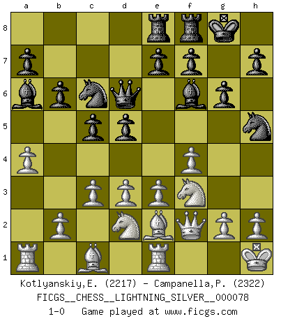 Last move : 1-0 2011 January 15 23:6:35 [Event "FICGS__CHESS__LIGHTNING_SILVER__000078"] [Site "FICGS"] [Date "2011.01.15"] [Round "1"] [White "Kotlyanskiy,Edward"] [Black "Campanella,Paul"] [Result "1-0"] [WhiteElo "2217"] [BlackElo "2322"] 1.f4 d5 2.Nf3 g6 3.d3 Nf6 4.e3 Bg7 5.Be2 O-O 6.O-O c5 7.c3 Nc6 8.Nbd2 Qd6 9.Qe1 b6 10.Qh4 Ba6 11.Kh1 Rae8 12.Re1 Nh5 13.a4 Bf6 14.Qf2 1-0 This chess game has been lost on time (started : 2011.01.15 22:27:9) Bird's Opening Kingside Castling by player Black (move 5) Kingside Castling by player White (move 6) Player White won this chess game. Follow this game move after move (download)Pawns: they are the soul of this game, they alone form the attack and defense. (Philidor) Wenn Schach ein enormer Dschungel ist, der seine Myriaden von Geheimnissen nicht preisgeben will, dann sind Computer die Kettensägen einer gewaltigen ökologisch unsensiblen Nutzholzfirma. (Nigel Short) Coloca el contenido de las piezas del Ajedrez en un sombrero, agitalo vigorosamente, arrojalas en un tablero desde una altura de 30 centimetros y así obtendras el estilo de Steinitz. (H. E. Bird) Donnez-moi un Cavalier en 6e et je gagnerais toutes mes parties. (Steinitz) A specialist learns more and more about less and less until he knows everything about nothing. (Nicholas Murray Butler)