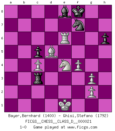 Last move : 1-0 2007 January 16 19:8:52 [Event "FICGS__CHESS__CLASS_D__000021"] [Site "FICGS"] [Date "2006.12.06"] [Round "1"] [White "Bayer,Bernhard"] [Black "Ghisi,Stefano"] [Result "1-0"] [WhiteElo "1400"] [BlackElo "1792"] 1.d4 Nf6 2.c4 g6 3.Nc3 Bg7 4.e4 d6 5.Nf3 O-O 6.Be2 c5 7.d5 Qb6 8.O-O h6 9.e5 dxe5 10.Nxe5 Bf5 11.Re1 Re8 12.Na4 Qd6 13.Bf4 Na6 14.Nxg6 e5 15.Nh4 Bd7 16.Be3 e4 17.Nc3 Qb6 18.Rb1 Qd8 19.a3 Kh8 20.Bf4 Rc8 21.Bg3 Ra8 22.Qb3 Qb6 23.Qxb6 axb6 24.Bd1 Kg8 25.Bc2 Nh5 26.Bxe4 Nxg3 27.hxg3 Kf8 28.Kf1 Nc7 29.d6 Bxc3 30.bxc3 Ne6 31.Bxb7 Rxa3 32.Nf3 Nd8 33.Rxb6 f6 34.Bd5 Bf5 35.Rc1 Nf7 36.d7 Bxd7 37.Rxf6 Re7 38.Re1 Be8 39.Nd2 Rxe1+ 40.Kxe1 Ke7 41.Re6+ Kf8 42.f4 Rxc3 43.Ne4 1-0 King's Indian : 6.Be2 Kingside Castling by player Black (move 5) Kingside Castling by player White (move 8) Player White won this chess game. Follow this game move after move (download)Spassky will not be psyched out by Fischer. (Mike Goodall) Ich liebe den Moment, wenn ich das Ego meines Gegenüber breche. (Robert James Fischer) Fischer sacrificó virtualmente todo lo que la mayoría de nosotros los 'debiles' (término que él usa) valoramos, respetamos y apreciamos por el amor de un astuto, a menudo hermoso tablero de juego, por el privilegio ambivalente de ser su mas grande maestro. (Paul Kollar) Les échecs, c'est l'imagination. (David Bronstein) When you don't know what to do, walk fast and look worried. (Anonymous)
