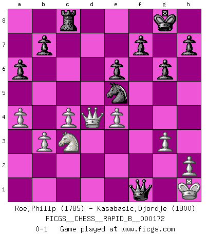 Last move : 0-1 2011 April 12 5:1:50 [Event "FICGS__CHESS__RAPID_B__000172"] [Site "FICGS"] [Date "2011.01.16"] [Round "1"] [White "Roe,Philip"] [Black "Kasabasic,Djordje"] [Result "0-1"] [WhiteElo "1785"] [BlackElo "1800"] 1.e4 c5 2.Nf3 d6 3.Bb5+ Bd7 4.Bxd7+ Qxd7 5.O-O Nc6 6.c4 Nf6 7.Nc3 g6 8.d4 cxd4 9.Nxd4 Bg7 10.Nde2 O-O 11.f3 a6 12.a4 e6 13.Bg5 Qc7 14.Kh1 Nd7 15.b3 Nc5 16.Rb1 Rac8 17.Bh4 Rfe8 18.Bg3 Be5 19.f4 Bg7 20.Bf2 Nb4 21.Bd4 Bh6 22.f5 Qe7 23.Rf3 Nd7 24.Qg1 Nc6 25.f6 Qd8 26.Rd1 Bg5 27.Be3 Bxf6 28.Rxd6 Be5 29.Rd3 Qe7 30.Rf1 Red8 31.Rfd1 Bc7 32.R3d2 Nde5 33.Bc5 Qh4 34.Nd4 Nxd4 35.Bxd4 Rxd4 36.Rxd4 Bb6 37.g3 Qf6 38.Rf1 Bxd4 39.Qxd4 Qxf1+ 0-1 Sicilian : Canal-Sokolsky attack, 3...Bd7 Kingside Castling by player White (move 5) Kingside Castling by player Black (move 10) Player Black won this chess game. Follow this game move after move (download)In Fischer's hands, a slight theoretical advantage is as good a being a Queen ahead. (Isaac Kashdan) Ich kenne keine einzige Person, die behaupten würde, Garri Kasparow sei ein guter Mensch (Nigel Short) Cuando tengo las piezas blancas, yo gano porque soy blanco; Cuando tengo las piezas negras, yo gano porque soy Bogolyubov. (Bogolyubov) Dans le domaine de la peinture, de la gravure et de la sculpture, dès la première décennie de notre siècle, les artistes abandonnent la représentation de la partie d'échecs pour se concentrer sur les pièces, sur les échiquiers et sur toutes les variations auxquelles les unes et les autres peuvent donner lieu. On passe en quelque sorte d'un thème social à un thème musical (au sens de la musica médiévale, c'est-à-dire d'une notion qui inclue le rythme, l'harmonie, la construction et la déconstruction, etc.). Graphiquement et picturalement, l'échiquier apparaît comme une structure ouverte, dynamique, d'une richesse infinie, autorisant toutes les combinatoires et débouchant sur des mouvements et des rythmes de nature exponentielle. (Michel Pastoureau) A cynic is a man who knows the price of everything but the value of nothing. (Oscar Wilde)