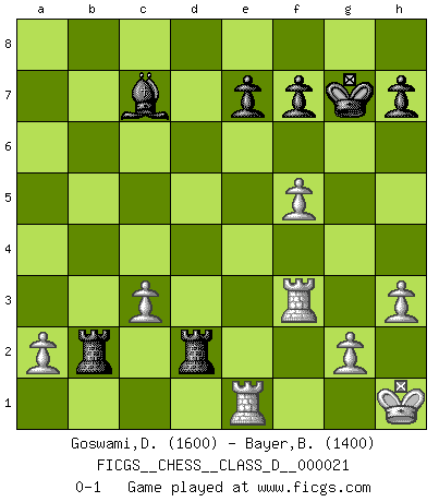 Last move : 0-1 2006 December 18 16:30:30 [Event "FICGS__CHESS__CLASS_D__000021"] [Site "FICGS"] [Date "2006.12.06"] [Round "1"] [White "Goswami,Deepjyoti"] [Black "Bayer,Bernhard"] [Result "0-1"] [WhiteElo "1600"] [BlackElo "1400"] 1.e4 c5 2.Nf3 d6 3.d4 cxd4 4.Nxd4 Nf6 5.Nc3 g6 6.f4 Nc6 7.Bb5 Bd7 8.Nxc6 bxc6 9.Ba4 Bg7 10.O-O Ng4 11.Qf3 Qa5 12.Bb3 Qh5 13.h3 Bd4+ 14.Kh1 Qh4 15.Nd1 O-O 16.c3 Bc5 17.Be3 Nxe3 18.Nxe3 Rab8 19.Kh2 a5 20.Rab1 Kg7 21.f5 Qg5 22.Nc4 gxf5 23.exf5 d5 24.Nxa5 Bb6 25.Nxc6 Bxc6 26.Bxd5 Bxd5 27.Qxd5 Bc7+ 28.Kg1 Qe3+ 29.Kh1 Rfd8 30.Qf3 Qxf3 31.Rxf3 Rxb2 32.Re1 R8d2 0-1 Sicilian : Dragon, Levenfish variation Kingside Castling by player White (move 10) Kingside Castling by player Black (move 15) Player Black won this chess game. Follow this game move after move (download)The tactician must know what to do whenever something needs doing; the strategist must know what to do when nothing needs doing. (Savielly Tartakover) Oft bringt ein stiller Zug das Erdbeben. (Richard Reti) El Ajedrez por encima de todo... ¡es una pelea!. (Emanuel Lasker) Les Echecs ne sont pas pour les âmes timides. Ils requièrent un homme entier, qui ne s'arrête pas aveuglément à ce qui a été déjà établi, mais qui tente individuellement de sonder les profondeurs du jeu. (W. Steinitz) Thibault, I ask for draw. Game 13876. - Sorry Ilmars, you won. (FICGS chat)