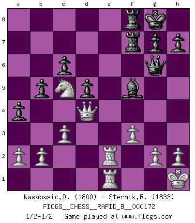 Last move : 1/2-1/2 2011 March 7 10:3:30 [Event "FICGS__CHESS__RAPID_B__000172"] [Site "FICGS"] [Date "2011.01.16"] [Round "1"] [White "Kasabasic,Djordje"] [Black "Sternik,Ryszard"] [Result "1/2-1/2"] [WhiteElo "1800"] [BlackElo "1833"] 1.e4 e5 2.Nf3 Nc6 3.Bb5 a6 4.Ba4 Nf6 5.O-O Nxe4 6.d4 b5 7.Bb3 d5 8.dxe5 Be6 9.Nbd2 Nc5 10.c3 Nxb3 11.Nxb3 Be7 12.Nfd4 Qd7 13.Nxc6 Qxc6 14.Be3 O-O 15.Qe2 f6 16.exf6 Bxf6 17.Qd2 Bg4 18.Bd4 Rf7 19.Bxf6 Rxf6 20.Rae1 Qd6 21.Qd4 Bf5 22.Re5 c6 23.Rfe1 a5 24.Nc5 a4 25.Nb7 Qf8 26.f3 Qf7 27.Nc5 Rf8 28.Kh1 Qg6 29.Qh4 R6f7 30.Qd4 Bg4 31.R5e3 Bc8 32.Nd3 Qd6 33.Re5 Bf5 34.Nc5 Qg6 35.R5e2 1/2-1/2 Ruy Lopez : Open, 7.Bb3 Kingside Castling by player White (move 5) Kingside Castling by player Black (move 14) This chess game ended in a draw. Follow this game move after move (download)Chess is in its essence a game, in its form an art, and in its execution a science. (Baron Tassilo) Zu meiner Zeit war ein 20 jähriger ein junger Spieler, heute ist er ein Veteran. (Garry Kasparov) El Ajedrez, como cualquier otra actividad creativa, puede existir solo a través de méritos combinados de aquellos que tienen talento creativo y de aquellos que tienen la habilidad de organizar un trabajo creativo. (Mikhail Botvinnik) Je fais ceci parce que dans cinquante coups j'obtiendrai cela; je m'appelle Mikhail Moisevitch Botvinnik. (Botvinnik) A mistake is only a mistake if you let it happen twice. Otherwise it is a learning experience. (Daniel Parmet)