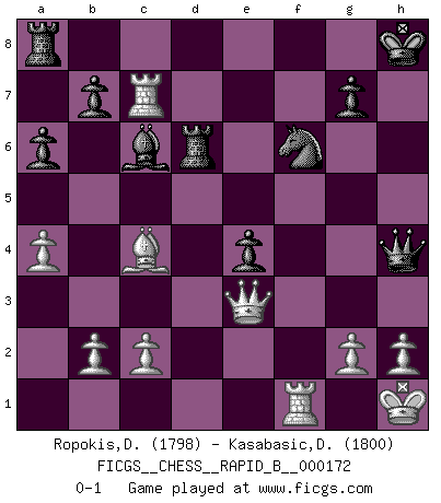 Last move : 0-1 2011 February 21 12:3:0 [Event "FICGS__CHESS__RAPID_B__000172"] [Site "FICGS"] [Date "2011.01.16"] [Round "1"] [White "Ropokis,Dimitrios"] [Black "Kasabasic,Djordje"] [Result "0-1"] [WhiteElo "1798"] [BlackElo "1800"] 1.d4 d5 2.Nc3 Nf6 3.e4 dxe4 4.f3 exf3 5.Nxf3 e6 6.Bg5 Be7 7.Bd3 Nc6 8.O-O Nxd4 9.Nxd4 Qxd4+ 10.Kh1 Bd7 11.Qd2 Bc6 12.a4 a6 13.Rf4 Qd6 14.Rc4 Nd5 15.Re1 O-O 16.Ne4 Qd8 17.Bxe7 Qxe7 18.Ng5 Nf6 19.Rf4 Rfd8 20.Ref1 Rd6 21.Qe2 e5 22.Nxh7 Nxh7 23.Rxf7 Qh4 24.Rxc7 e4 25.Bc4+ Kh8 26.Qe3 Nf6 0-1 Blackmar-Diemer : Euwe defense Kingside Castling by player White (move 8) Kingside Castling by player Black (move 15) Player Black won this chess game. Follow this game move after move (download)Chess is like life. (Boris Spassky) Das Zentrum ist der Balkan des Schachbretts - Kriegshandlungen können in jedem Moment ausbrechen. (Aaron Nimzowitsch) Las combinaciones han sido siempre el aspecto más intrigante del Ajedrez. Los Maestros las buscan, el público las aplauden, los críticos las alaban. La razón se debe a que las combinaciones hacen posible que el Ajedrez sea más que un ejercicio matemático con una carencia de vida. Ellas son la poesía del juego, son del Ajedrez lo que la melodía es de la música. Ellas representan el triunfo de la mente sobre la materia. (Reuben Fine) Nous sommes les pions de la mystérieuse partie d'Echecs jouée par Dieu. Il nous déplace, nous arrête, nous pousse encore, puis nous lance un à un dans la boîte du Néant. Epitaphe sur la tombe de David Janowsky (1868-1927). Computers are like Old Testament gods; lots of rules and no mercy. (Joseph Campbell)