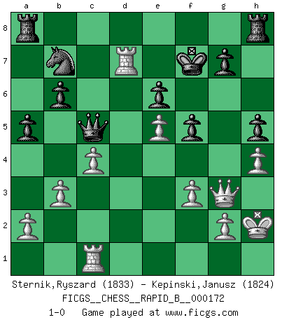 Last move : 1-0 2011 March 16 20:19:26 [Event "FICGS__CHESS__RAPID_B__000172"] [Site "FICGS"] [Date "2011.01.16"] [Round "1"] [White "Sternik,Ryszard"] [Black "Kepinski,Janusz"] [Result "1-0"] [WhiteElo "1833"] [BlackElo "1824"] 1.e4 e6 2.Qe2 c5 3.Nf3 b6 4.Qd1 Ba6 5.Bxa6 Nxa6 6.O-O Be7 7.d4 cxd4 8.Qxd4 Nf6 9.e5 Nd5 10.Qg4 Kf8 11.Rd1 Nc5 12.Na3 f5 13.Qh3 Ne4 14.Nd4 Bc5 15.c4 Bxd4 16.Rxd4 Nb4 17.f3 Nc5 18.Qg3 h6 19.Rd6 Nbd3 20.Nc2 a5 21.b3 h5 22.h4 Nxc1 23.Rxc1 Nb7 24.Rd2 Qc7 25.Nd4 Qc5 26.Kh2 Kf7 27.Nxe6 dxe6 28.Rd7+ 1-0 French : Chigorin variation Kingside Castling by player White (move 6) Player White won this chess game. Follow this game move after move (download)You must take your opponent into a deep dark forest where 2+2=5, and the path leading out is only wide enough for one. (Mikhail Tal) Ich tröste mich mit dem Vergnügen, daß Schachfans, Zuschauer und Leser glücklich sind, wenn ein Großmeister etwas riskiert, statt nur Klötzchen zu schieben. (Mikhail Nekhemyevich Tal) Un jugador que trata de regresar una movida en el Ajedrez es un futuro carterista. (Richard Fenton) Il n'y a pas de prix trop élevé au scalp de l'ennemi. (Koblentz) To send light into the darkness of men's hearts - such is the duty of the artist. (Schumann)