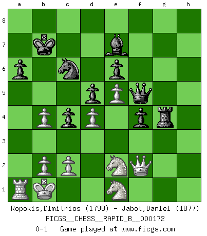 Last move : 0-1 2011 March 8 7:31:30 [Event "FICGS__CHESS__RAPID_B__000172"] [Site "FICGS"] [Date "2011.01.16"] [Round "1"] [White "Ropokis,Dimitrios"] [Black "Jabot,Daniel"] [Result "0-1"] [WhiteElo "1798"] [BlackElo "1877"] 1.d4 f5 2.e4 fxe4 3.f3 d5 4.Be3 e6 5.fxe4 Qh4+ 6.Kd2 Nf6 7.e5 Ne4+ 8.Kc1 Nf2 9.Bxf2 Qxf2 10.Nf3 g6 11.Nbd2 c5 12.Bb5+ Bd7 13.Bxd7+ Nxd7 14.Qf1 Qe3 15.Qb5 O-O-O 16.Re1 Qf4 17.Qa5 a6 18.Kb1 g5 19.g3 Qf5 20.Re2 c4 21.Qc3 b5 22.Qa5 Nb8 23.Rg2 Be7 24.g4 Qg6 25.h3 Kb7 26.Qc3 Nc6 27.a3 Rdf8 28.Rg3 h5 29.gxh5 Qf5 30.Qe3 Rxh5 31.Ng1 Rh4 32.Rf3 Rf4 33.Rxf4 gxf4 34.Qf2 Rg8 35.Ndf3 Rg3 36.Ne2 Rxh3 37.Neg1 Rg3 38.Ne2 Rg8 39.Neg1 Rg3 40.Ne2 Rg6 41.Ne1 b4 42.axb4 Rg4 0-1 Dutch : Staunton gambit Queenside Castling by player Black (move 15) Player Black won this chess game. Follow this game move after move (download)A thorough understanding of the typical mating continuations makes the most complicated sacrificial combinations leading up to them not only not difficult, but almost a matter of course. (Siegbert Tarrasch) Charakterschwächen offenbaren sich normalerweise während einer Schachpartie. (Garry Kasparov) Debes de llevar a tu oponente hacia un profundo y obscuro bosque donde 2+2=5, y el camino que conduce a la salida es suficientemente ancho para solamente uno. (Mikhail Tal) Le génie consiste à savoir transgresser les règles au moment opportun. (Teichmann) Waiting for chance ? Play in casinos. (FICGS proverb)