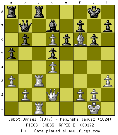 Last move : 1-0 2011 March 31 9:58:41 [Event "FICGS__CHESS__RAPID_B__000172"] [Site "FICGS"] [Date "2011.01.16"] [Round "1"] [White "Jabot,Daniel"] [Black "Kepinski,Janusz"] [Result "1-0"] [WhiteElo "1877"] [BlackElo "1824"] 1.e4 e6 2.d4 d5 3.e5 b6 4.Bb5+ Bd7 5.Bd3 c5 6.c3 Ne7 7.Nf3 cxd4 8.cxd4 g6 9.O-O Bg7 10.Nc3 O-O 11.h3 Nbc6 12.Re1 Nb4 13.Bb1 Rc8 14.a3 Nbc6 15.Bd3 a5 16.Nb5 Ra8 17.Bf4 Na7 18.Nd6 Qb8 19.Qd2 Nac8 20.Rac1 Nxd6 21.exd6 Nc6 22.Bb5 Qb7 23.Re3 Rfe8 24.Bxc6 Bxc6 25.Rec3 Rec8 26.Ne5 Bxe5 27.Bxe5 Bd7 28.Bf6 1-0 French : Advance variation Kingside Castling by player White (move 9) Kingside Castling by player Black (move 10) Player White won this chess game. Follow this game move after move (download)The Pawns are the soul of the game. (Francois Andre Danican Philidor) Das Spiel gibt uns die Genugtuung, die das Leben uns versagt. (Emanuel Lasker) Muchos jugadores de Ajedrez se sorprendían cuando después de la partida, Fischer explicaba con calma: 'Yo ya había analizado esta posibilidad' en una posición en la cual yo creía que no era posible de prever desde la apertura. (Mikhail Tal) Psychologiquement, tu dois avoir confiance en toi même, mais cette confiance doit être basée sur des faits. (Robert Fischer) A bird doesn't sing because it has an answer, it sings because it has a song. (Maya Angelou)