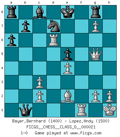 Last move : 1-0 2006 December 18 20:16:49 [Event "FICGS__CHESS__CLASS_D__000021"] [Site "FICGS"] [Date "2006.12.06"] [Round "1"] [White "Bayer,Bernhard"] [Black "Lopez,Andy"] [Result "1-0"] [WhiteElo "1400"] [BlackElo "1500"] 1.e4 c5 2.Nf3 e6 3.d4 cxd4 4.Nxd4 Nc6 5.Nc3 a6 6.Be2 Qc7 7.O-O Nf6 8.Bg5 Nxd4 9.Qxd4 Bd6 10.Kh1 Be5 11.Qe3 d6 12.f4 Bxc3 13.bxc3 Nd7 14.f5 e5 15.Rad1 Qa5 16.Rxd6 h6 17.f6 hxg5 18.fxg7 Rg8 19.Qxg5 Qxa2 20.Rxf7 Qb1+ 21.Rf1 1-0 Sicilian : Taimanov variation Kingside Castling by player White (move 7) Player White won this chess game. Follow this game move after move (download)When you absolutely don't know what to do anymore, it is time to panic. (John van der Wiel) Wer wird heute Abend ihr Gegner sein? -- Heute Abend spiele ich gegen die schwarzen Steine. (Akiba Rubinstein) El Ajedrez se juega con la mente... ¡no con las manos!. (Renaud y Kahn) Horreur, mais aussi harmonie suprême : qu'y avait-il en effet au monde en dehors des échecs ? Le brouillard, l'inconnu, le non-être... (Vladimir Nabokov) Industry executives and analysts often mistakenly talk about strategy as if it were some kind of chess match. But in chess, you have just two opponents, each with identical resources, and with luck playing a minimal role. The real world is much more like a poker game, with multiple players trying to make the best of whatever hand fortune has dealt them. In our industry, Bill Gates owns the table until someone proves otherwise. (David Moschella, 'Computerworld')