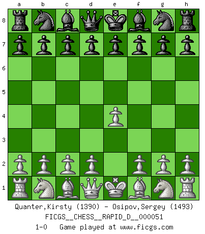 Last move : 1-0 2011 February 4 12:59:29 [Event "FICGS__CHESS__RAPID_D__000051"] [Site "FICGS"] [Date "2011.01.18"] [Round "1"] [White "Quanter,Kirsty"] [Black "Osipov,Sergey"] [Result "1-0"] [WhiteElo "1390"] [BlackElo "1493"] 1.e4 1-0 King's pawn Opening Player White won this chess game. Follow this game move after move (download)All that matters on the Chessboard is good moves. (Bobby Fischer) Wer nie einen Fehler gemacht hat, hat nie etwas Neues ausprobiert. (Albert Einstein) El Ajedrez, como cualquier otra actividad creativa, puede existir solo a través de méritos combinados de aquellos que tienen talento creativo y de aquellos que tienen la habilidad de organizar un trabajo creativo. (Mikhail Botvinnik) Le plus grand jeu de l'esprit jamais inventé, plus vous l'apprenez, plus vous y prenez du plaisir. (Garry Kasparov) Fame, I have already. Now I need the money. (an elderly Steinitz)