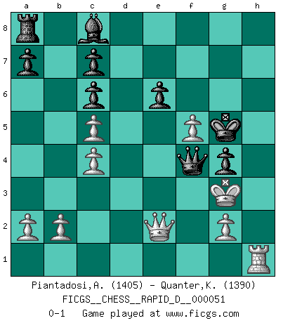 Last move : 0-1 2011 February 21 3:57:45 [Event "FICGS__CHESS__RAPID_D__000051"] [Site "FICGS"] [Date "2011.01.18"] [Round "1"] [White "Piantadosi,Angelo"] [Black "Quanter,Kirsty"] [Result "0-1"] [WhiteElo "1405"] [BlackElo "1390"] 1.d4 d5 2.c4 e6 3.Nc3 Nf6 4.Bg5 Bb4 5.Nf3 Nc6 6.e3 h6 7.Bh4 g5 8.Bg3 Ne4 9.Qc2 h5 10.Ne5 h4 11.Nxc6 bxc6 12.Bd3 hxg3 13.Bxe4 gxf2+ 14.Kxf2 dxe4 15.Nxe4 f5 16.Nc5 Bxc5 17.dxc5 Qf6 18.Rad1 Kf7 19.Rhf1 Rxh2 20.Rh1 Rxh1 21.Rxh1 Kg6 22.Qe2 g4 23.e4 Qd4+ 24.Kg3 Kg5 25.exf5 Qf4+ 0-1 QGD : 4.Bg5 Player Black won this chess game. Follow this game move after move (download)I prefer to lose a really good game than to win a bad one. (David Levy) Alle Schachspieler sollten auch ein Hobby haben. (Savielly Grigorievitsch Tartakower) Cuando tu casa esta en llamas, no puedes ser molestado por tus vecinos. O, como decinos en Ajedrez, si tu Rey esta bajo ataque, no te preocupa perder un Peón del lado de la Reina. (Gary Kasparov) Si je n'étais pas joueur d'échecs, je serais le meilleur dans quelque chose d'autre. (Anatoli Karpov) The Internet is the first thing that humanity has build that humanity doesn't understand, the largest experiment in anarchy that we have ever had. (Eric Schmidt)