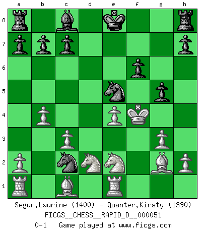 Last move : 0-1 2011 January 24 22:1:9 [Event "FICGS__CHESS__RAPID_D__000051"] [Site "FICGS"] [Date "2011.01.18"] [Round "1"] [White "Segur,Laurine"] [Black "Quanter,Kirsty"] [Result "0-1"] [WhiteElo "1400"] [BlackElo "1390"] 1.e4 e5 2.d3 Nc6 3.c3 Nf6 4.g3 d5 5.f3 Bc5 6.b4 Bb6 7.f4 dxe4 8.dxe4 Bf2+ 9.Kxf2 Qxd1 10.Nd2 Ng4+ 11.Kg2 Ne3+ 12.Kf2 Nc2 13.Ne2 Qe1+ 14.Kf3 exf4 15.Bg2 Ne5+ 16.Kxf4 f6 17.Rxe1 g5+ 0-1 Variation Indian Opening : Indian Opening Player Black won this chess game. Follow this game move after move (download)Bobby is the most misunderstood, misquoted celebrity walking the face of this earth. (Yasser Seirawan) Über Frauen: Chess is better. (Robert James Fischer) Un entendimiento minucioso de las típicas continuaciones de mate hacen de las mas complicadas combinaciones de sacrificio que conducen hacia ellas no solo no dificiles, sino casi un asunto de rutina. (Siegbert Tarrasch) Avant la finale, les dieux ont créé le milieu de partie. (Tarrasch) Fear is the path to the dark side. Fear leads to anger; anger leads to hate; hate leads to suffering. I sense much fear in you. (Master Yoda in Star Wars ep.1)